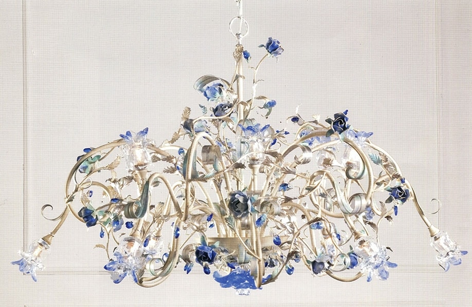 Kronleuchter 12 Lichter G9 max 40 Watt / schattiertes Elfenbein-Finish, Tempera, antikes Blattsilber / transparente Murano-Lichtdiffusoren blau / transparente Scholer-Kristalle blau. Strukturabmessungen Durchmesser cm 105 Höhe cm 75