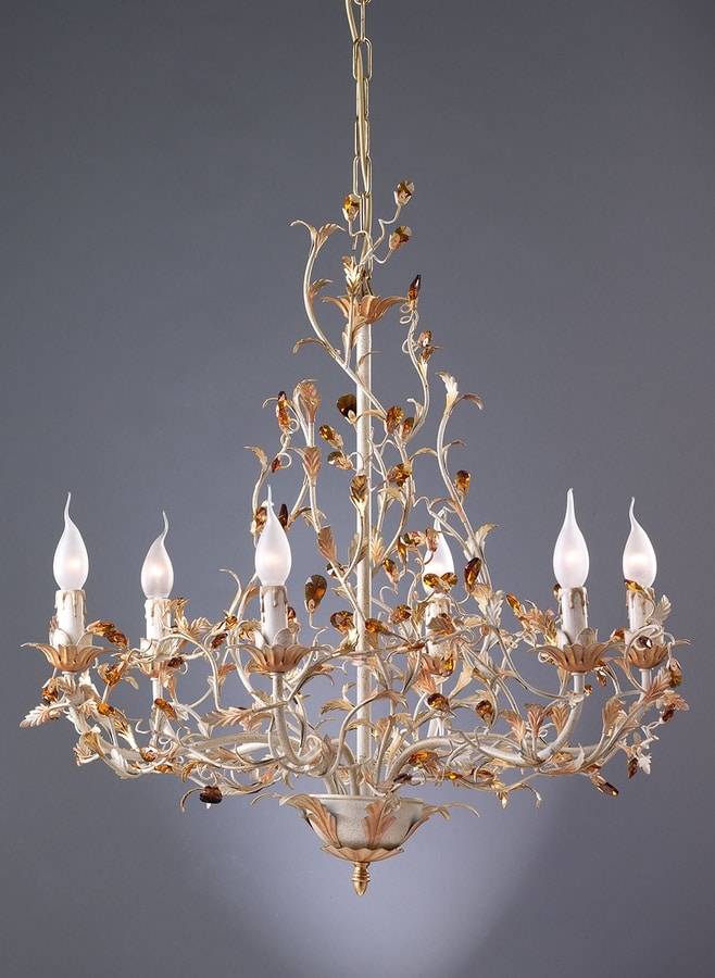 Kronleuchter 6 Lichter E14 max 40 Watt / Elfenbein-Finish, Schattierungen von grünem Tempera-Lachs, antike Blattgold / Bernstein-Scholer-Kristalle.