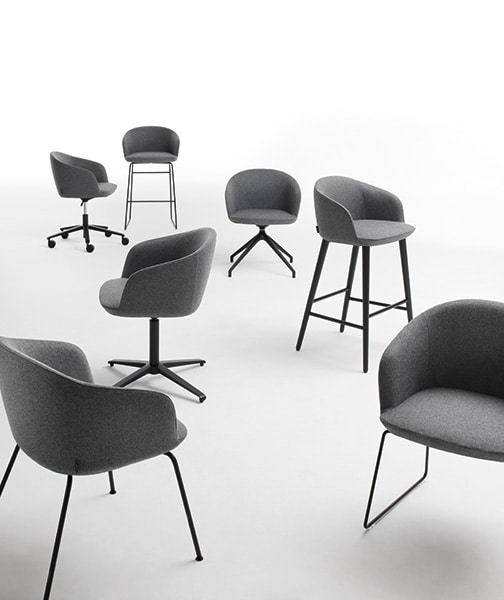 Milos ist eine Kollektion kleiner Sessel und Hocker mit Metall- und Holzgestellen. Die Integration von Rückenlehnensitzen und Armlehnen erhöht den Komfort und prägt unverkennbar den Stil. Form und Proportionen werden durch einfarbige, zweifarbige oder zweiteilige Polsterungen hervorgehoben.