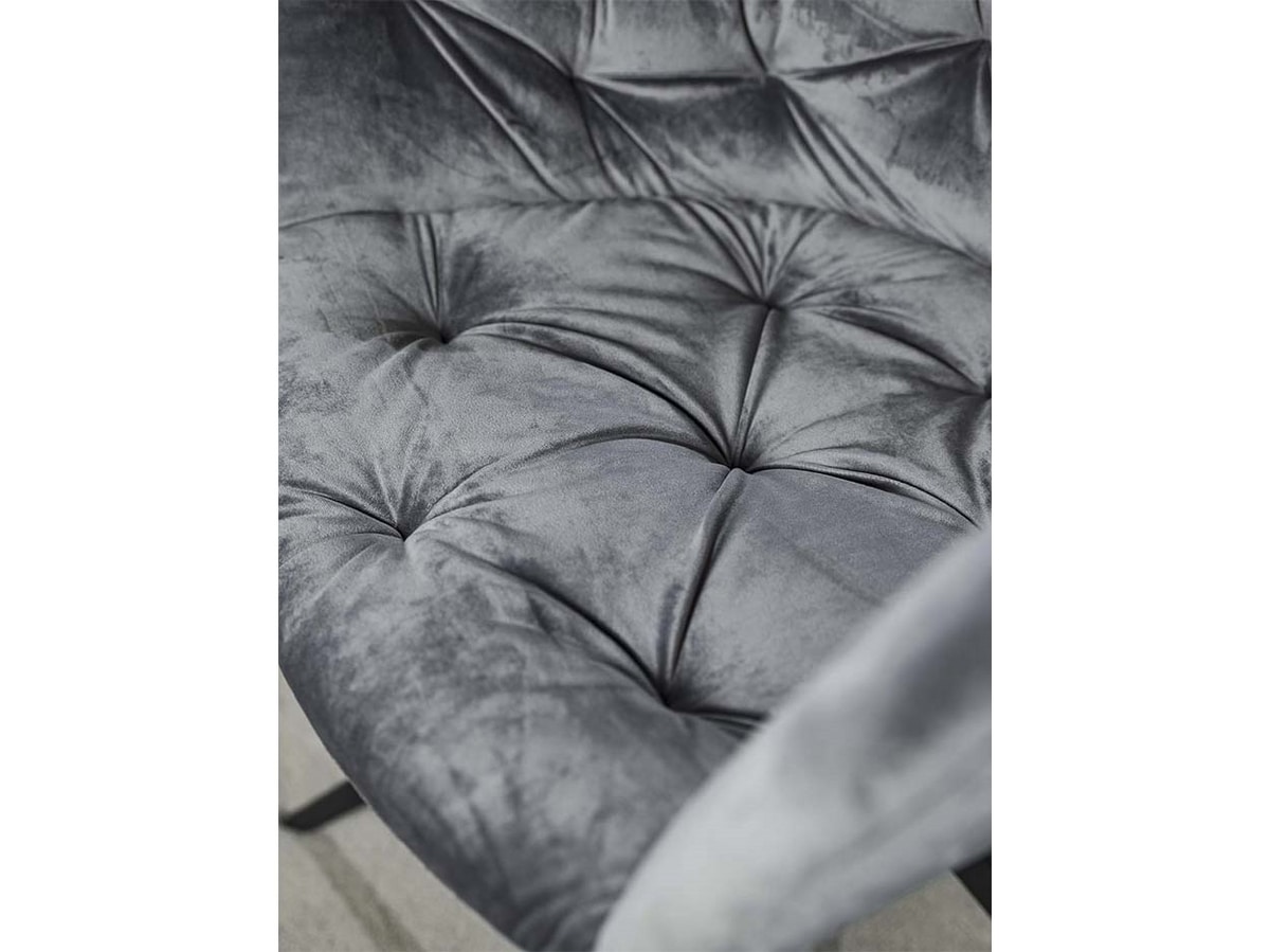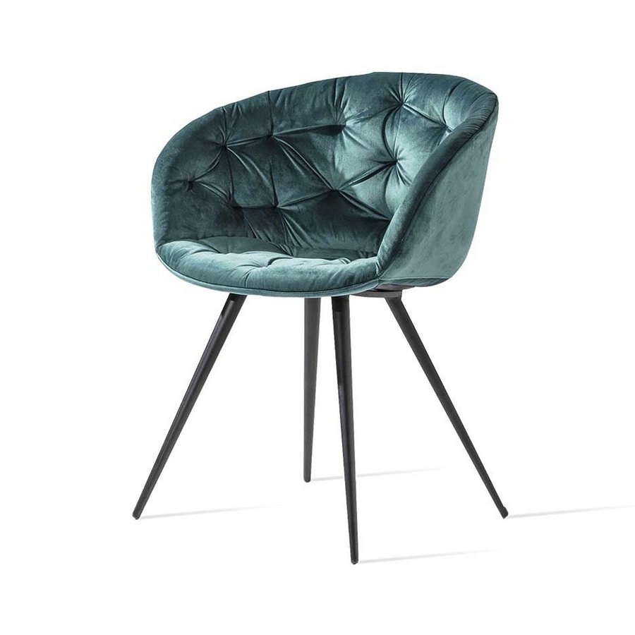 Metallsessel mit mattschwarz lackierter 4-Fuß-Struktur, schaumgepolsterter Polyurethan-Schale und weicher Capitonné-Polsterung aus Nubukleder- oder Samtimitat.