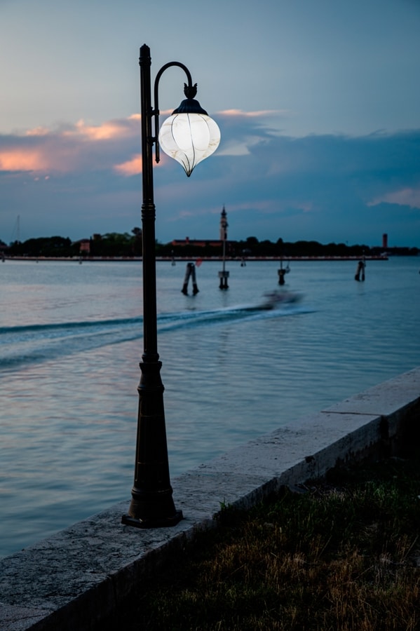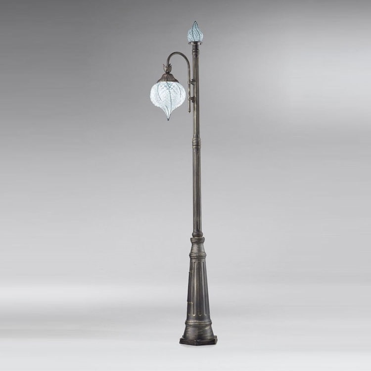 Gartenlampenpfosten mit mundgeblasenen Glasdiffusoren mit den Techniken der alten Murano-Glasmeister.