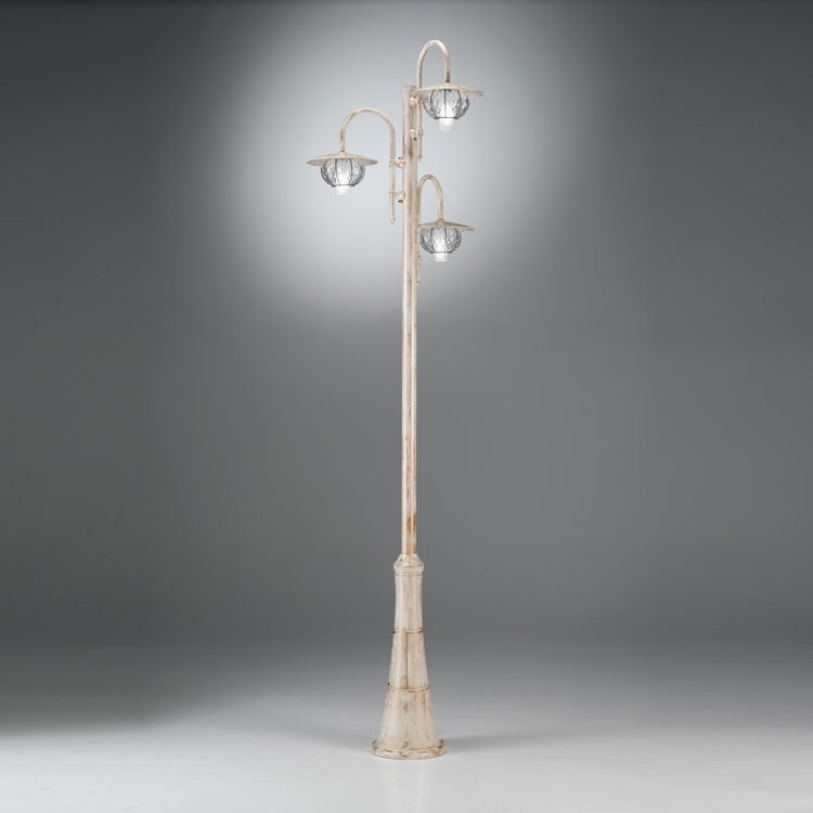 Klassischer Laternenpfahl mit drei mundgeblasenen Glasdiffusoren, die mit den Techniken der alten Murano-Glasmeister hergestellt wurden