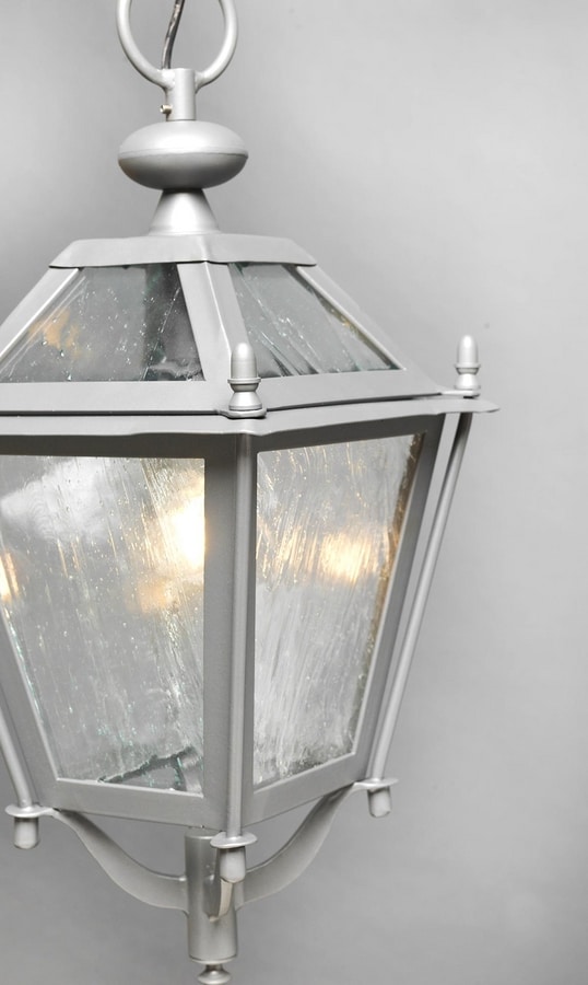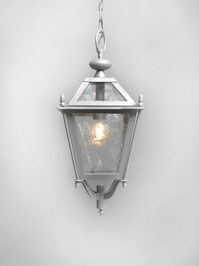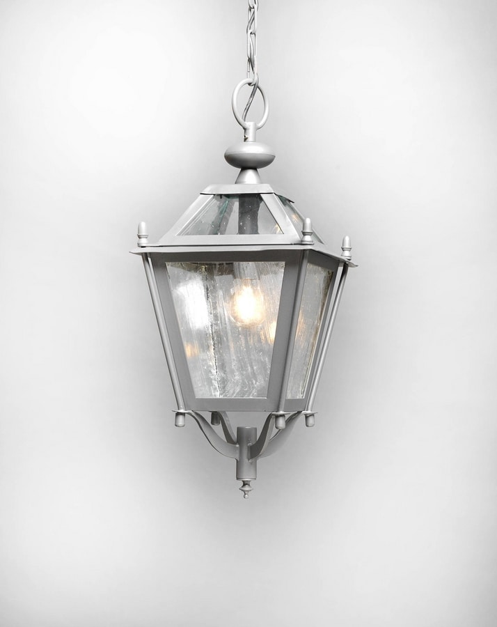 Kettenlaterne aus Eisen mit Glas, verzinkt und pulverbeschichtet.
