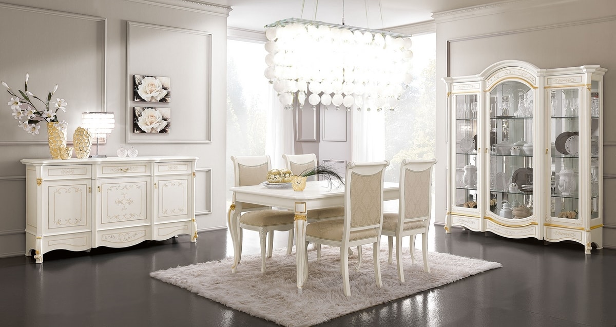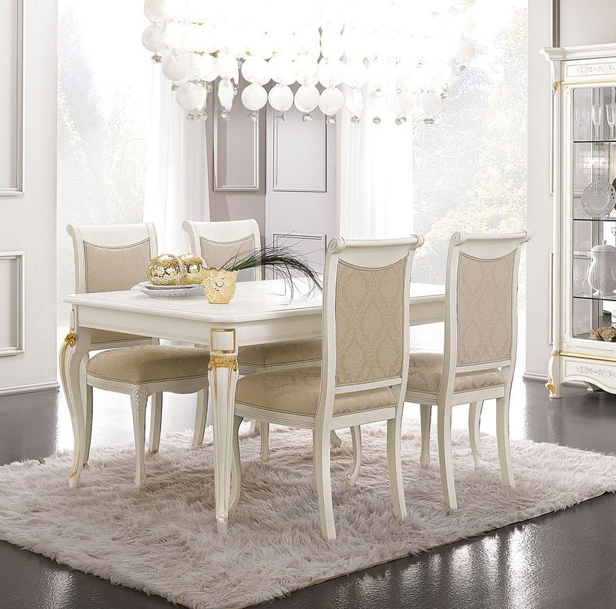 Rechteckiger ausziehbarer Tisch aus lackiertem Holz mit goldenen Details. Ideal für elegante Speisesäle im klassischen Stil.