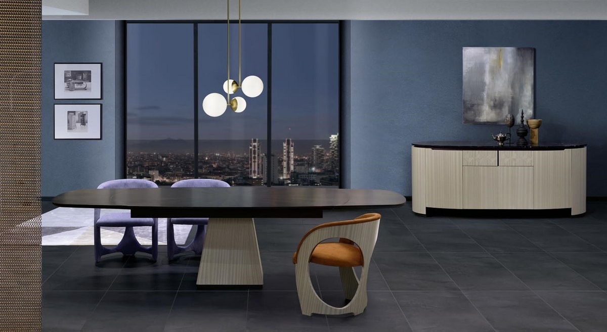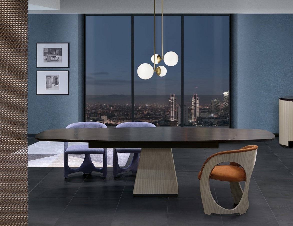 Holztisch mit ausziehbarer Platte aus Sycomoro Dark Frisè. Mit einem hölzernen trapezförmigen Sockel.