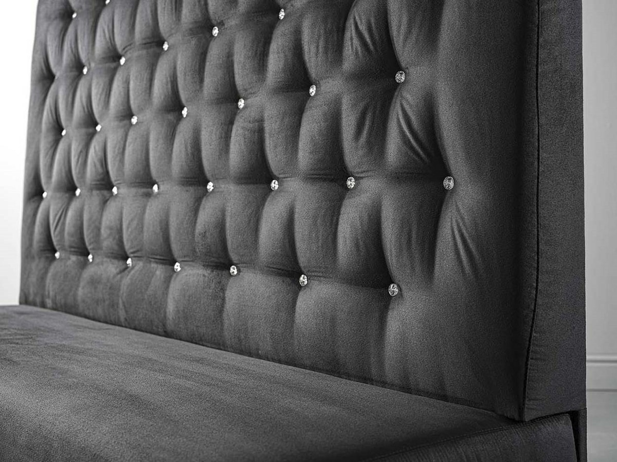 Tauchen Sie ein in den Zauber unserer Polsterbank, bei der Komfort harmonisch mit elegantem Design verschmilzt. Sein fachmännisch in Schwarz, Anthrazit oder Satin lackiertes Untergestell bildet einen faszinierenden Kontrast zur Weichheit der Samt- oder Kunstlederpolsterung.