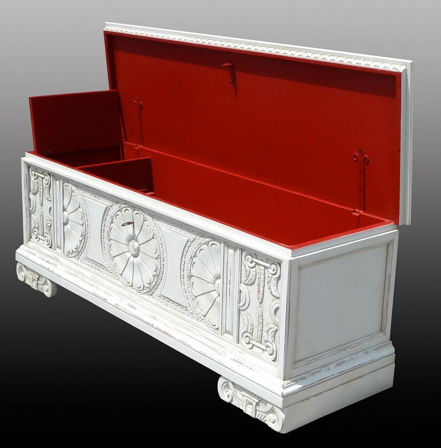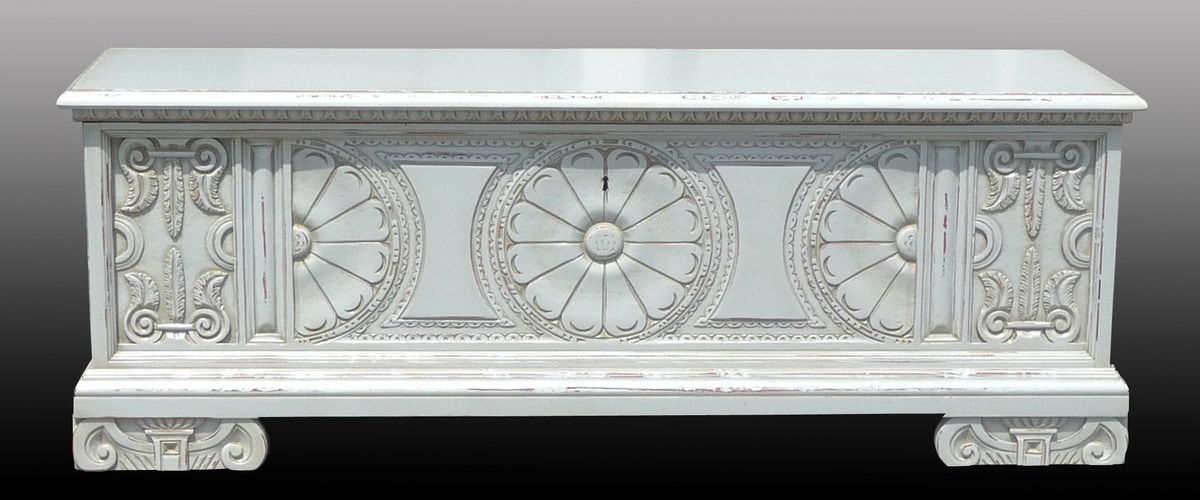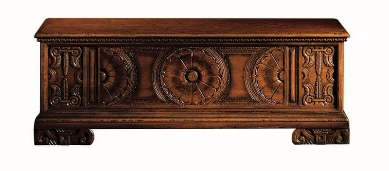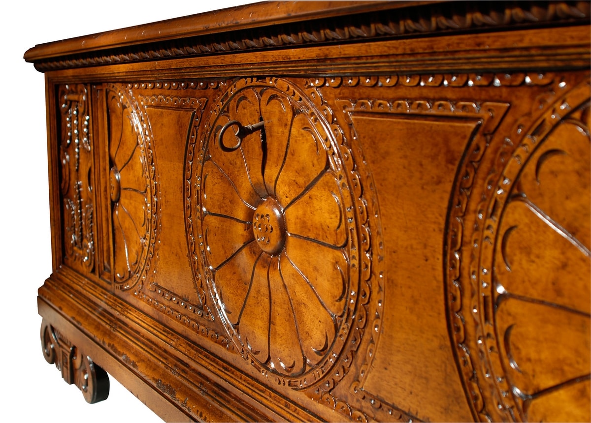 Geschnitzte Walnusskiste, inspiriert von der sienesischen Schule aus dem 16. Jahrhundert. Deckel, der mit einem Schlüssel geöffnet, verziert und mit geschnitzten Kerben geformt werden kann. Vorderseite mit einer Rosette in der Mitte und Banddekorationen an den Seiten geschnitzt, die die Arbeit hervorheben, die mit feinem Geschick im Schreinerhandwerk ausgeführt wurde. Pilasterstreifen an den Seiten mit Akanthusblättern geschnitzt. Füße auch mit einem ionischen Hauptmotiv modelliert, das für die Einrichtung dieser Zeit typisch ist. Innenraum aus tiefem Tannenholz.