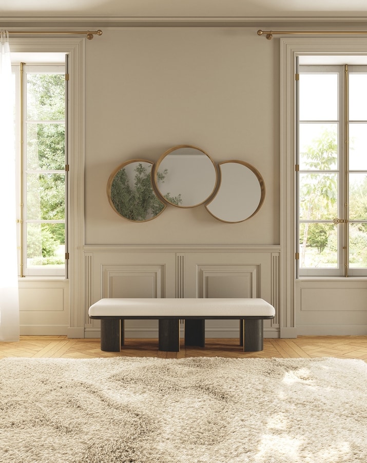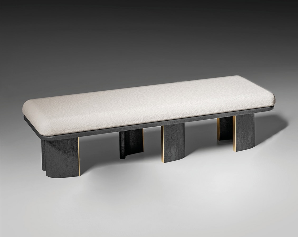 Die Bank besteht aus einer modularen Wiederholung dieses geschwungenen Beins: Jedes zusätzliche Element verlängert ihre Form und definiert ihre Größe. Auf diese Weise lässt sich die Bank frei an unterschiedliche Wohnkontexte anpassen – vom Eingangsbereich bis zum Essbereich, vom Wohnzimmer bis zum Schlafzimmer – und behält dabei eine starke ästhetische Konsistenz bei.