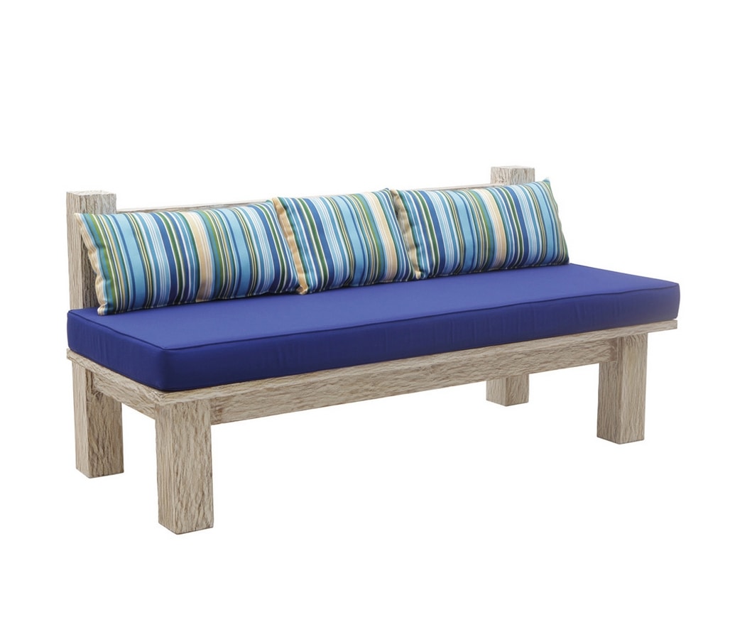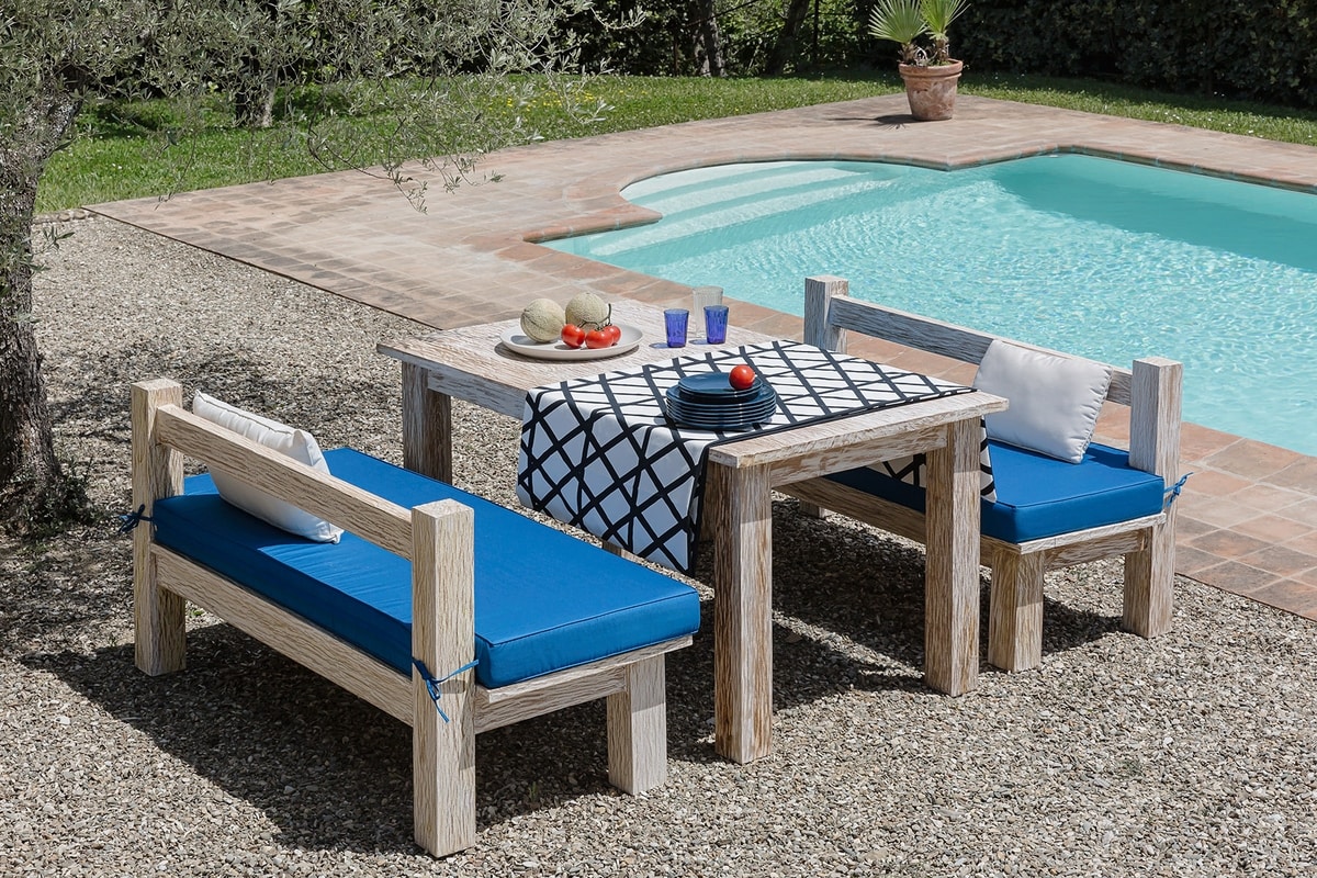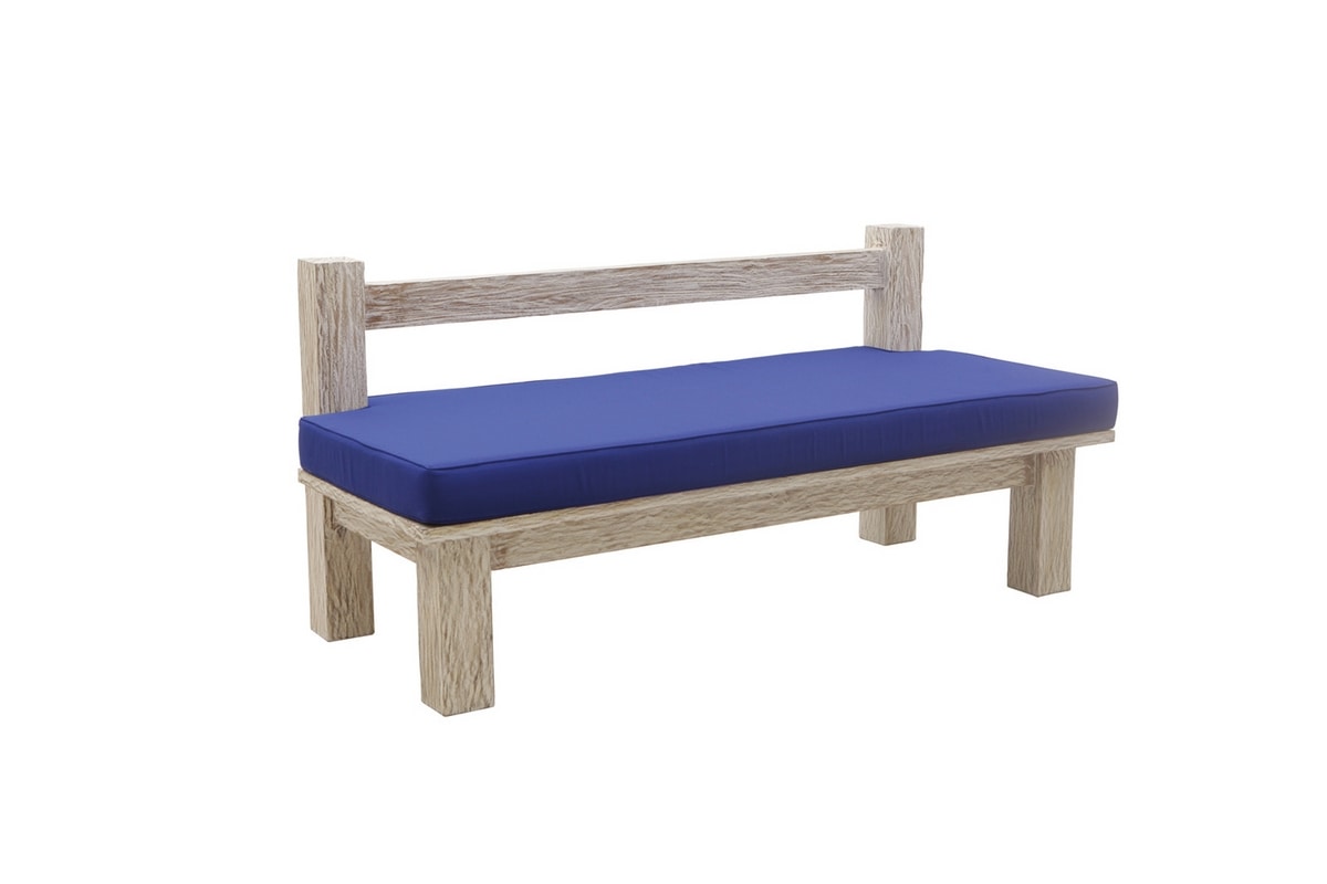 Zweisitzige Massivholzbank aus Teakholz mit dem exklusiven Finish Weißer Sand von Il Giardino di Legno. Hergestellt aus wetterbeständigem Teakholz mit charakteristischem White Wash Finish. Auf Anfrage in verschiedenen Ausführungen erhältlich. Kissen für den Außenbereich aus Polyurethanschaum. Die Standardversion ist mit Outdoor Deluxe-Stoffen, Farbe Ecru und weiteren Stoffen und Farben erhältlich.