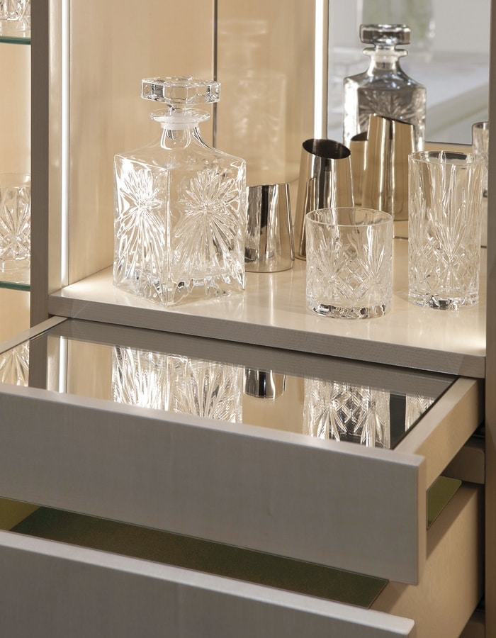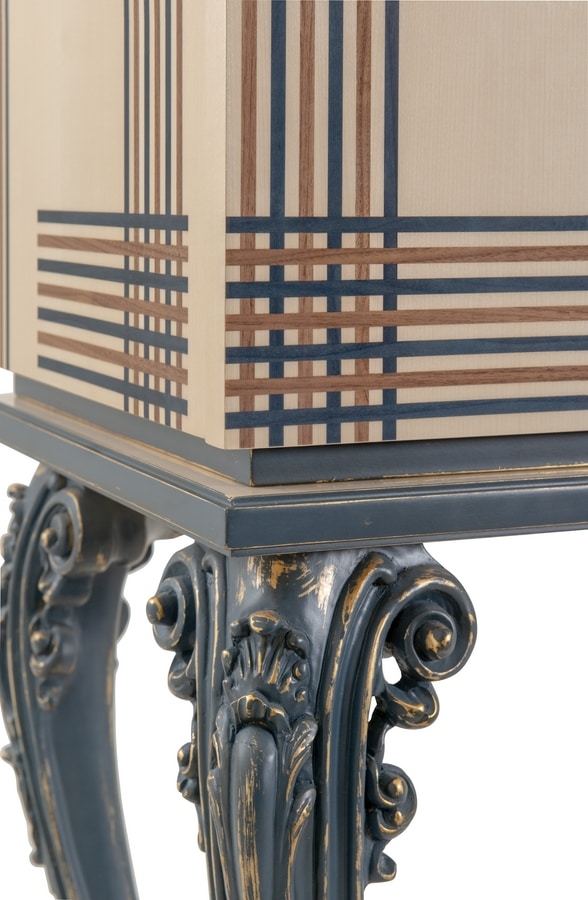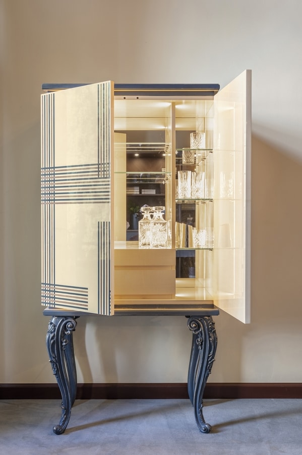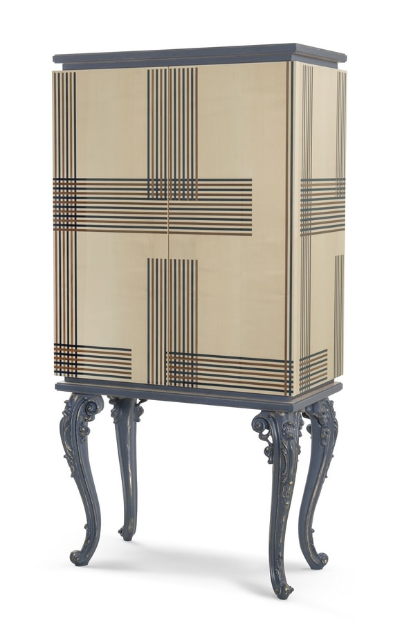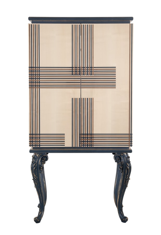 Ein raffiniertes und visuell markantes Bar -Schrank mit einem eleganten geometrischen Inlay in Canaletto Walnut und Blue Bolivar über einem leichten Ahornhintergrund. Das Innenraum mit Glasregalen und Schubladen bietet sowohl Funktionalität als auch dekorative Anziehungskraft. Die fein geschnitzte Basis, die in verzweifeltem blauem Lack über Blattgold gelegt wurde, ruft klassische Motive mit zeitgemäßer Wendung hervor. Ein Hochglanz-Finish verbessert die Helligkeit und Raffinesse des Kabinetts.