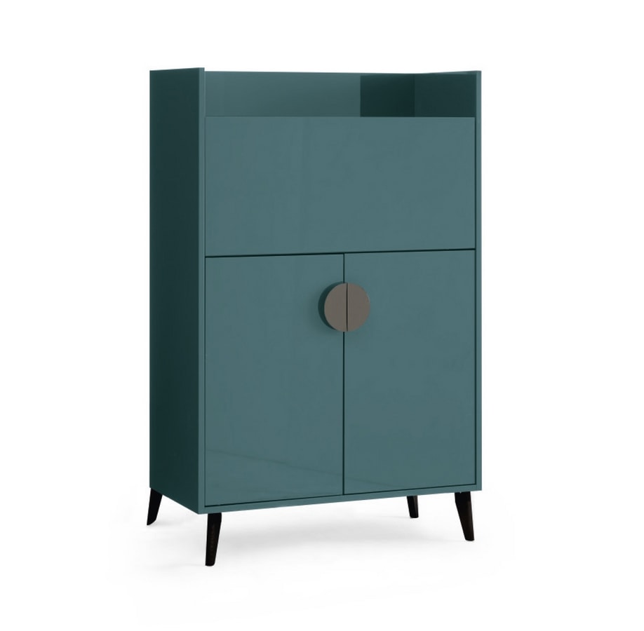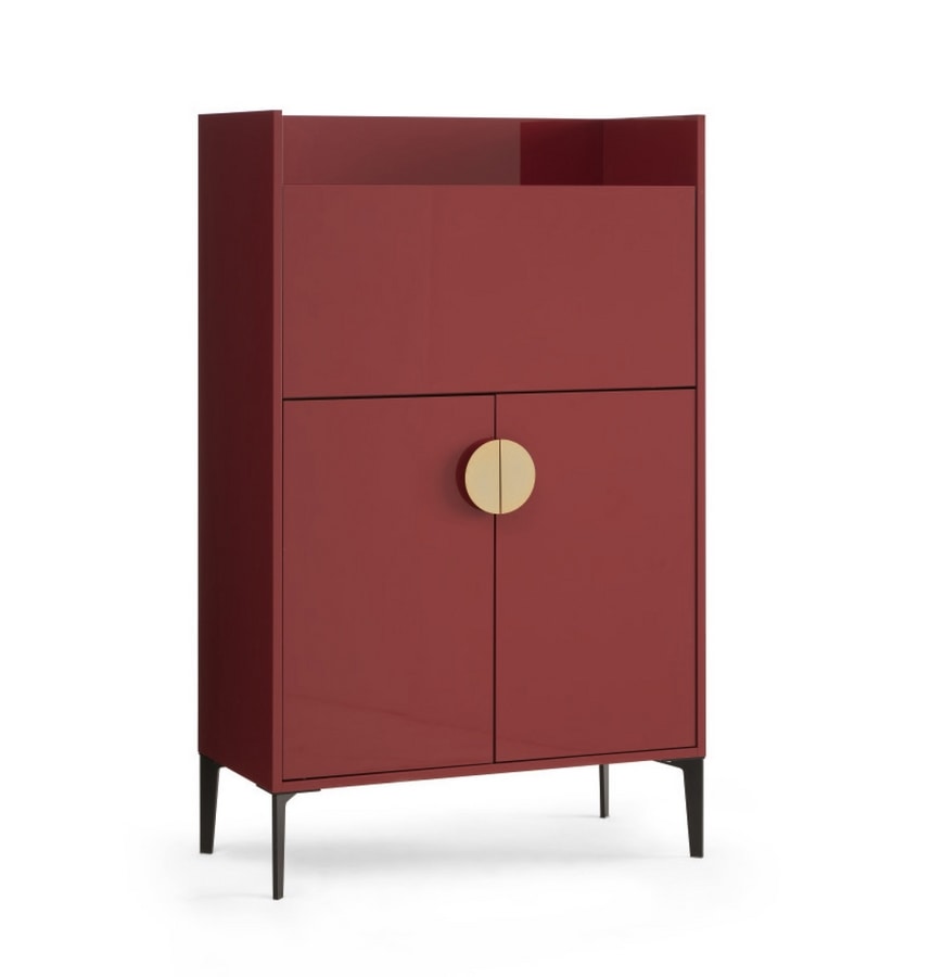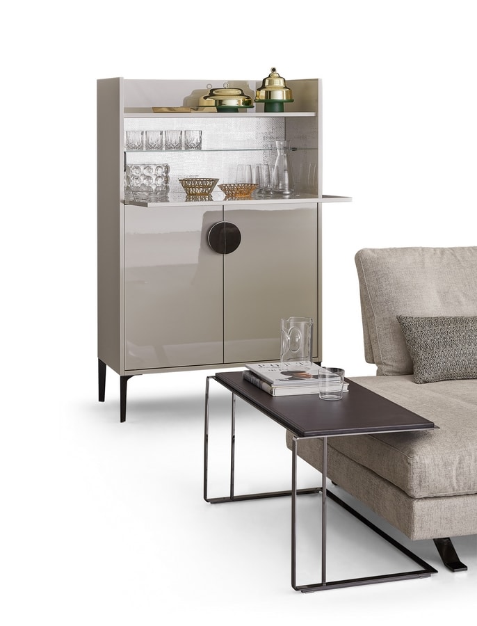 2-Türer-Barschrank mit offener Regale und Dropdown-Tür, innere Regale neu positionierbar, Glasregal und Spiegeltür hinter der Dropdown-Tür. Rahmen und Regale: In MDF (19 mm Dicke) mit Polyester beschichtet und glänzend lackiert. Scharniere: „Bluemotion“ mit integriertem Mechanismus für Soft-Clase. Scharniere an der Dropdown-Tür mit einem macherischen Schließmechanismus. Griff: Stahl mit goldenem, schwarzem Nickel und verchromtem Elektroplatten. Füße: In Stahl oder dunkelbraunem bemaltem Holz (Ral 8022) mit nicht rutschfesten Füßen.
