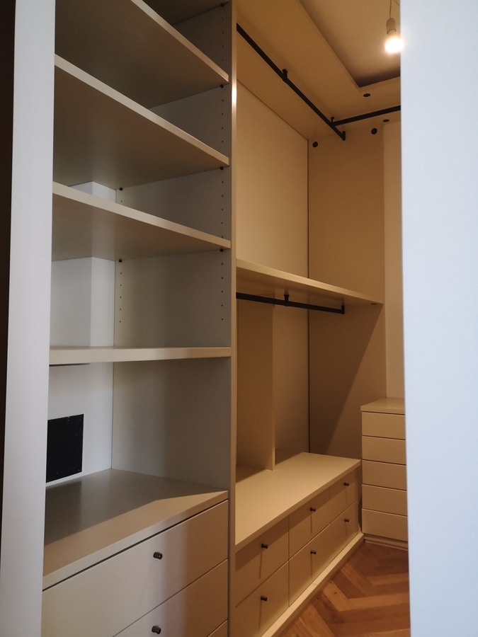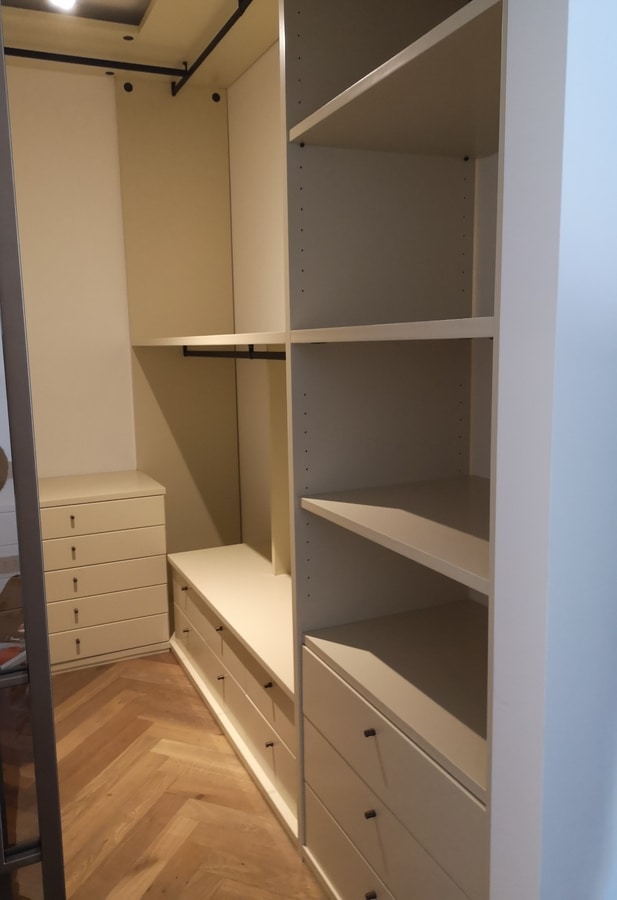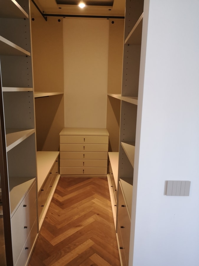 Maßgeschneiderter begehbarer Kleiderschrank aus weißem Holz.