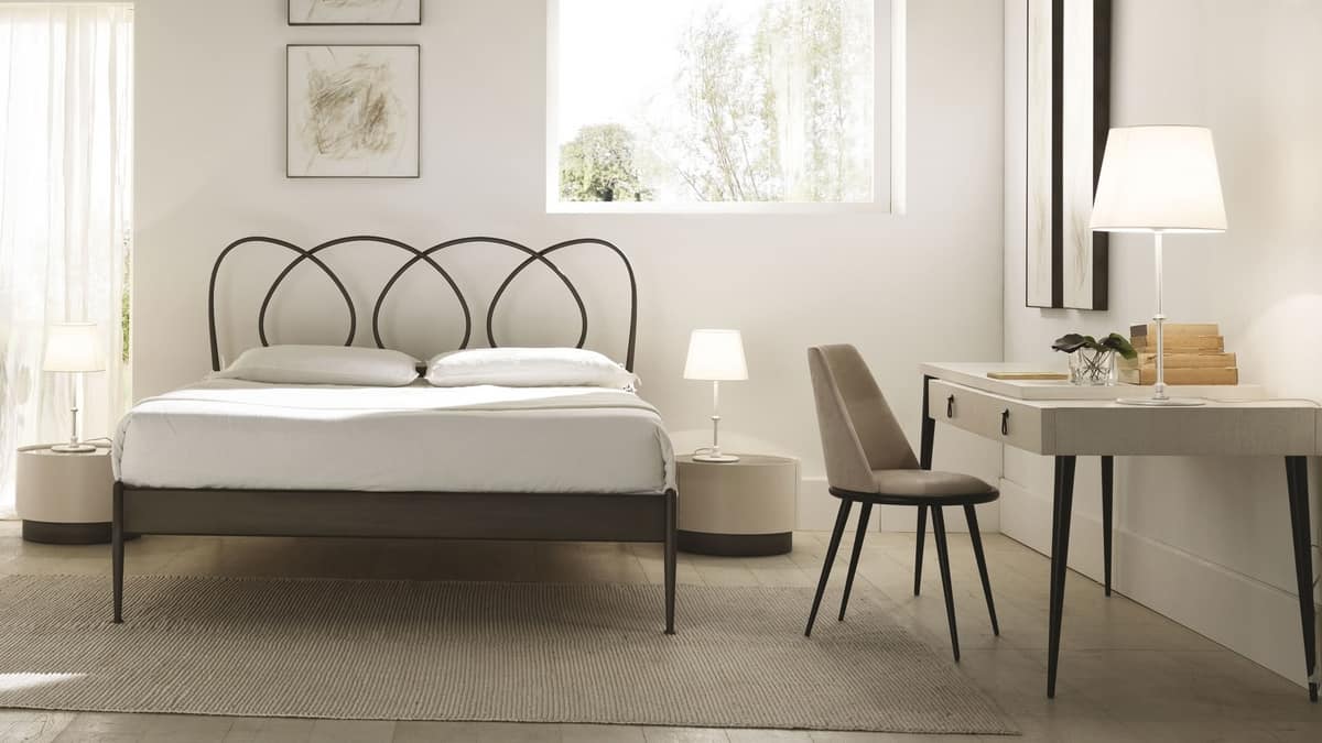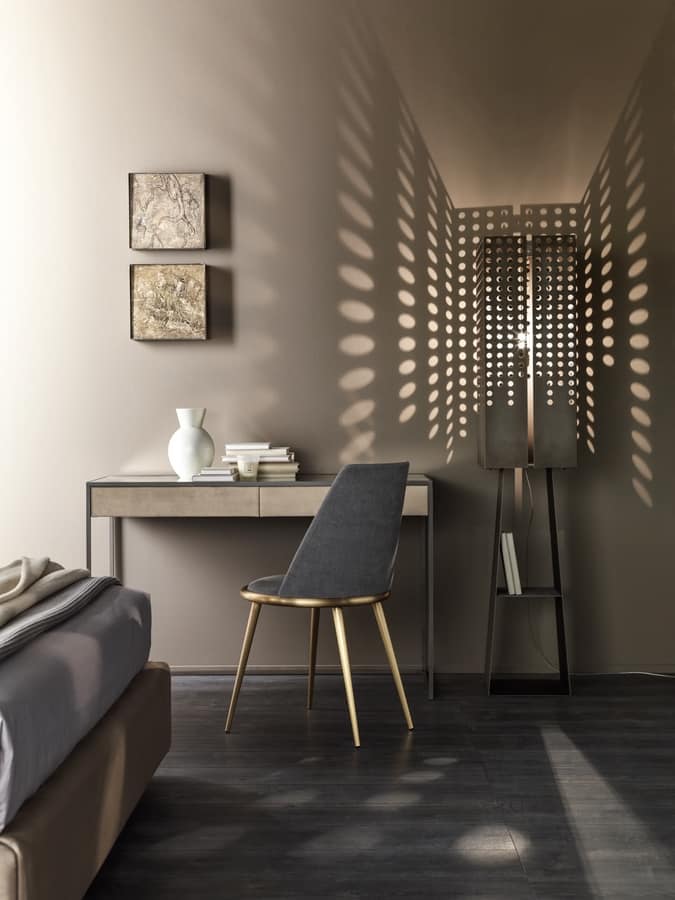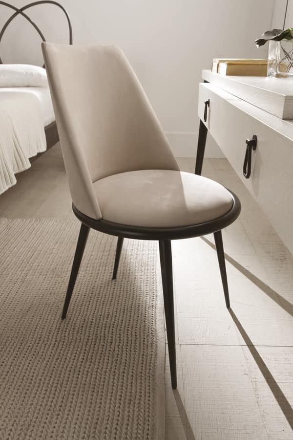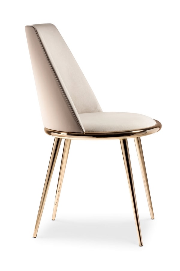 Aurora Stuhl mit exklusivem Design mit konischen Metallstangen. Der stabförmige Rücken mit Sunburst-Effekt ist mit interner Zugluftbefestigung versehen. Es kann mit einer modischen Verarbeitung aus Stoff, Samt, Leder oder, zur Anpassung der Umgebung, aus vom Kunden geliefertem Stoff gepolstert werden. Nicht entfernbar.
