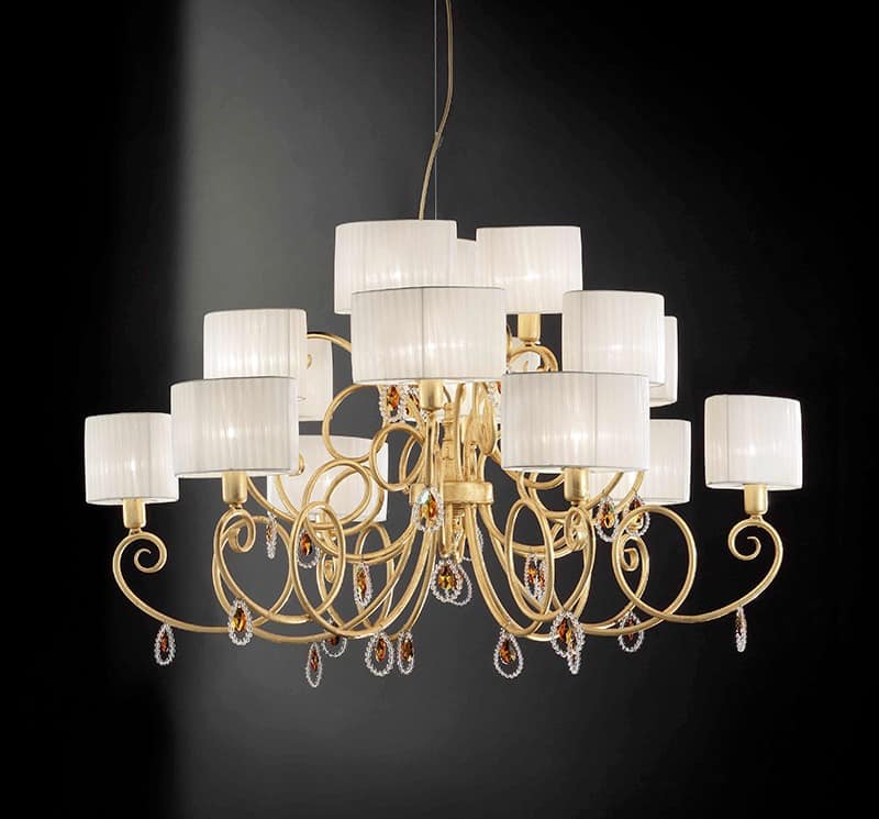 Kronleuchter mit 15 Lichtern und Eisenrahmen. Kronleuchter mit Kristall Anhänger.