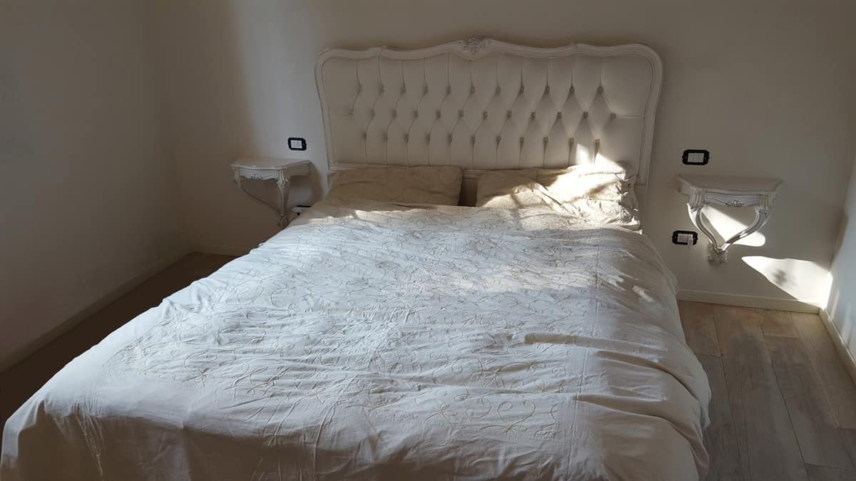 Doppelbett, handgeschnitzt, weiß lackiert, mit silbernen Blättern dekoriert, gesteppt und in Kunstleder gepolstert, ausgestattet mit Lack-Box-Container, im Stil Louis XVI entworfen.