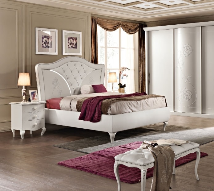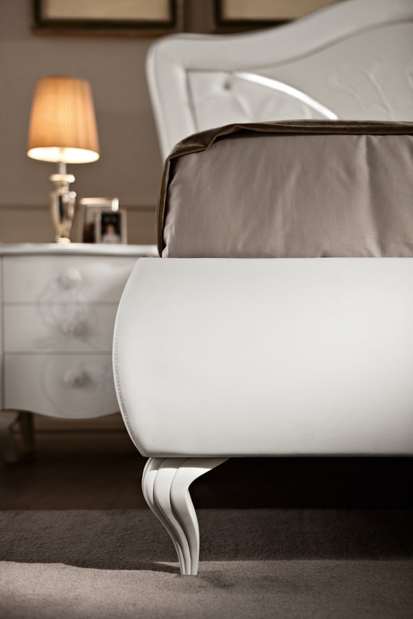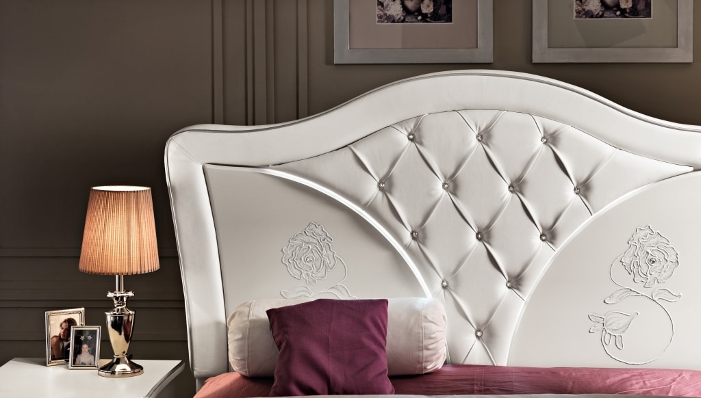 Bett-Mod. Brigitte, Kopfteil bestehend aus zwei Seitenwänden aus matt weiß lackiertem Holz mit zentraler handgefertigter Dekoration, gepolstert mit Capitonè und weißem Kunstleder mit Swarovski-Einsätzen. Hoch gepolsterter Bettrahmen aus weißem Kunstleder mit Behälter und Netz inklusive. Auf dem Kopf geführt.