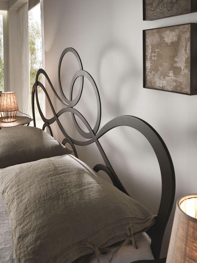 Bed of laser-geschnitten Flacheisen , kontinuierlichen Drahtvorschubschweißnähte vollständig von Hand gerieben. Verjüngt und geschmiedeten Elementen. Das Kopfteil reflektiert werden kann. Acht Schichten Finishing, von der internen Ausgangspunkt, um die transparente Fixiermittel Schutz. Handgefertigte Metallblattvorlage . Bed Schienen h. 14 cm. Bettgestell nicht inbegriffen.