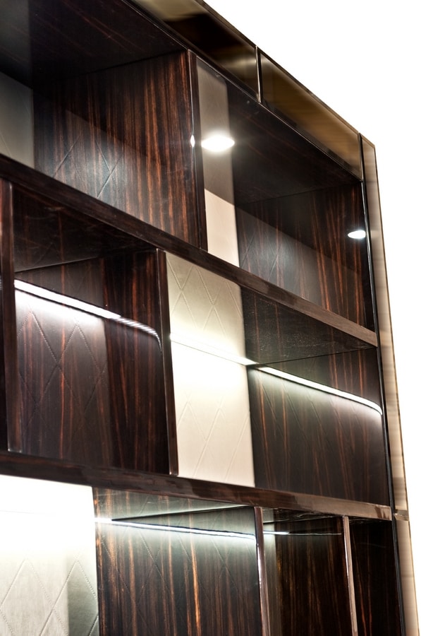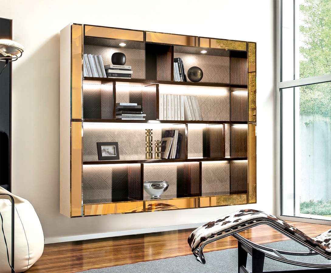 Schwebendes Bücherregal aus Makassar-Ebenholz und Bronzespiegel.