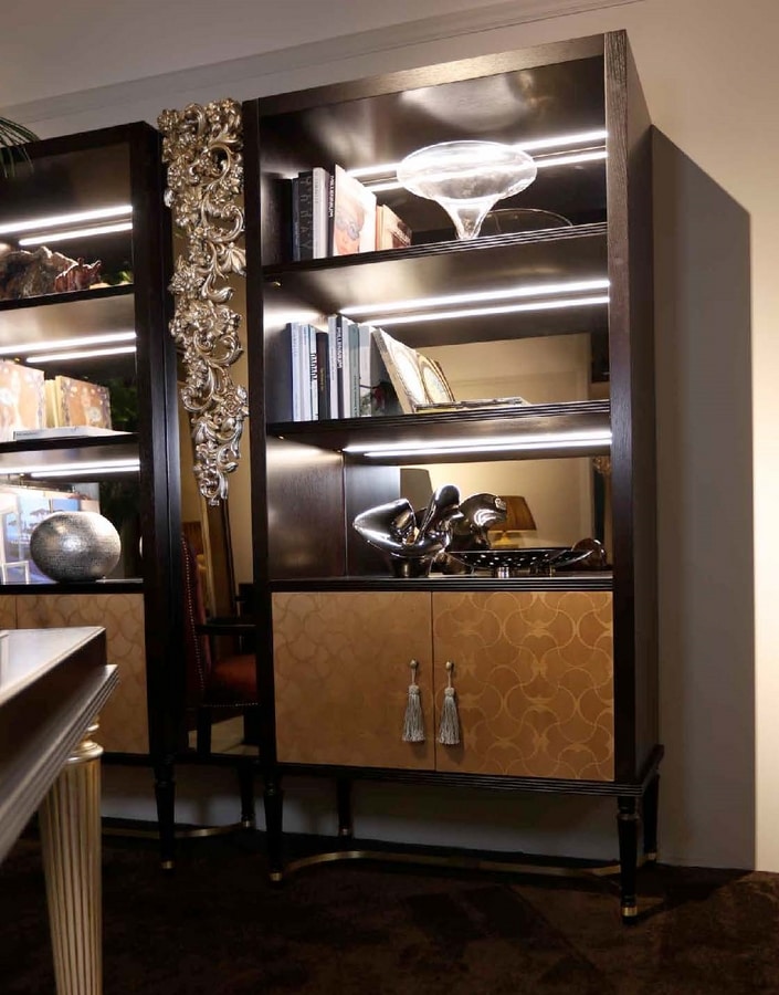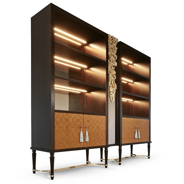 Die Eichenstruktur ist mit einem dunkelbraunen Lack getönt; Die Türen sind mit Aniegré-Inlays furniert. Die Holzregale sind mit einem bequemen LED-Lichtstreifen ausgestattet.