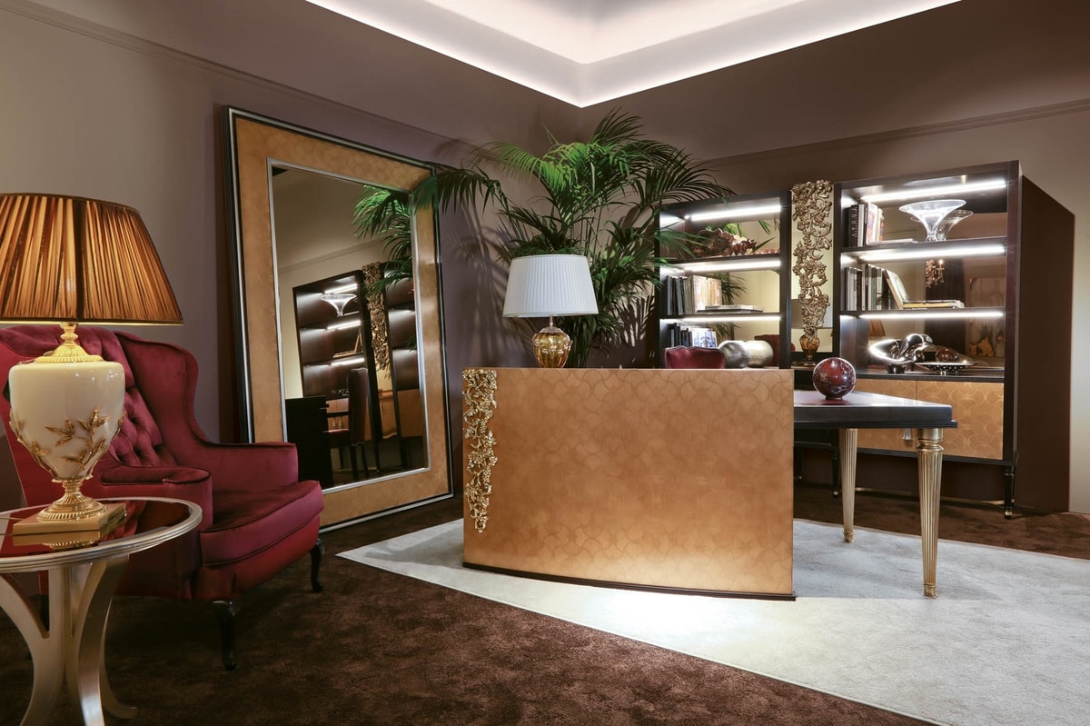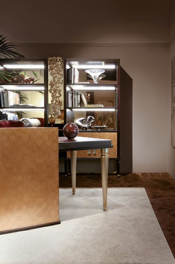 Die Flora-Kollektion ist in den Versionen aus dunkelbrauner Eiche oder aus hell gebeiztem Kotò-Holz und in Aniegré für Wohnzimmer und Büro gefertigt, immer mit Details in Champagner-Blattsilber-Finish.