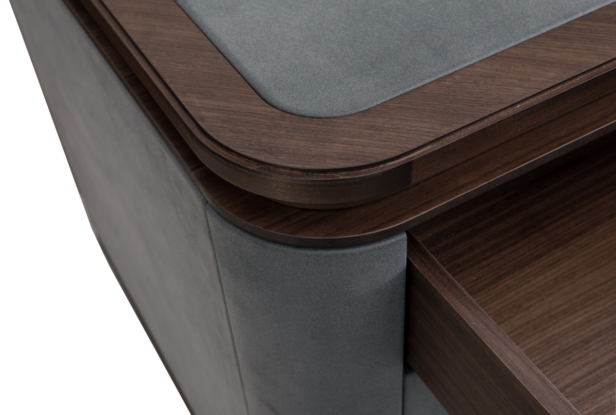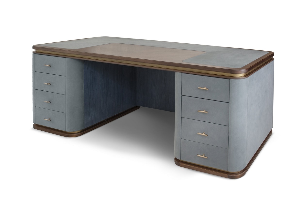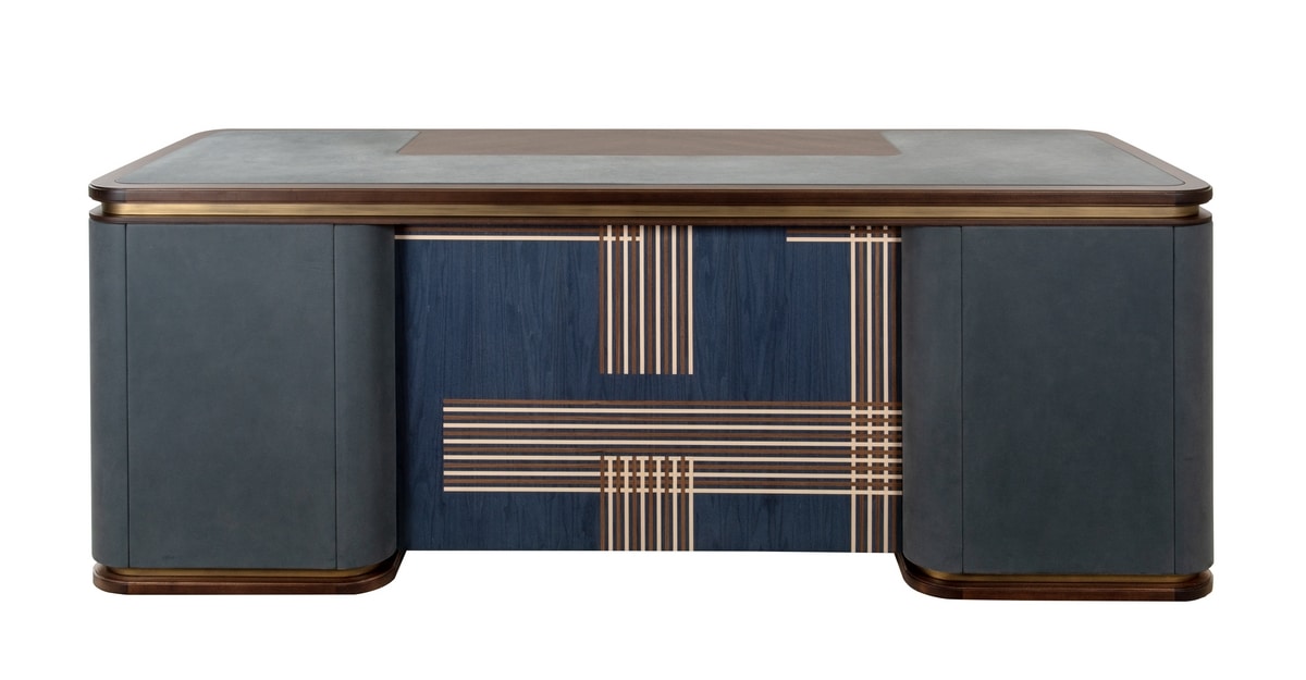 Prestigeträchtiges Schreibtisch mit einem mit Maple und Canaletto Walnut aufgelobten Frontplatte auf einem blauen Bolivar -Hintergrund. Das in Canaletto Walnut gefertigte Oberteil ist durch einen zentralen Ledereinsatz angereichert und durch eine voll aus Leder gekleidete Struktur ergänzt. Ausgestattet mit acht Schubladen verfügt es über ein mattes poliertes Finish und raffinierte Details aus Bronze, wobei die zurückhaltende Eleganz und das zeitgenössische Flair verkörpert werden.