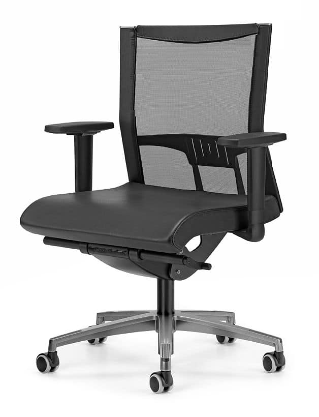 Optional: Struktur und Armlehnen aus poliertem Edelstahl, Chrom Basis, verstellbare Lendenwirbelstütze, Sitztiefe adjustement, automatische Rückführung AGR.