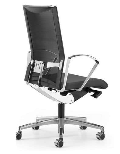Optional: Struktur und Armlehnen aus poliertem Edelstahl, Chrom- Basis, verstellbare Lordosenstütze, Sitztiefenverstellung, automatische Rücklaufsystem AGR.