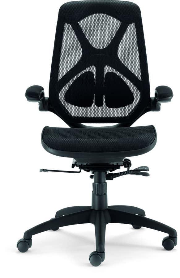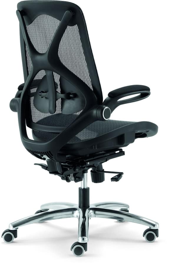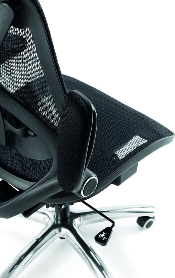 Bürostuhl mit Mesh-Rückenlehne. Gepolsterte und verstellbare Armlehnen. Verchromte oder schwarze Unterseite mit Rollen. Höhenverstellbar durch Gasmechanismus. Lendenwirbelsäule Sitz mit technischem Stoff abgedeckt
