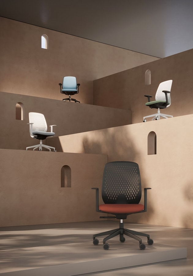 Gekennzeichnet durch eine ergonomische Rückenlehne aus mikroperforiertem, flexiblem, glasfaserverstärktem Polypropylen sind KEY SMART, KEY SMART ADVANCED und KEY SMART STOOL in verschiedenen Varianten verfügbar, sodass eine neue individuelle Komforterfahrung ermöglicht wird.