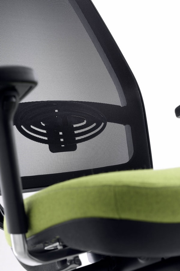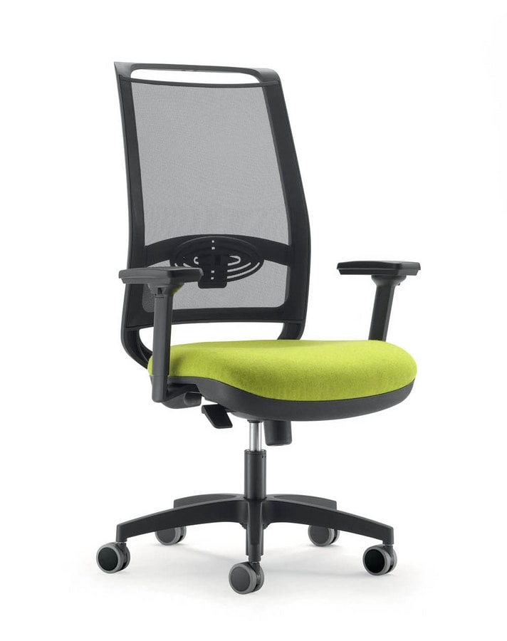 Bürostuhl mit gepolstertem Sitz und Netzrücken. Ausgestattet mit Lordosenstütze.