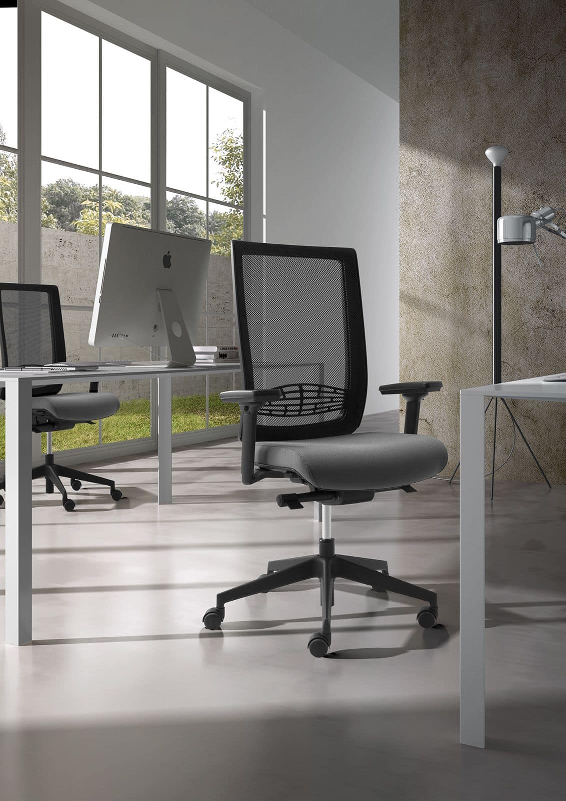 Netzrückenlehne mit verstellbarer Lordosenstütze. Die dazu passenden Besuchersessel mit Netzrücken und Stahlgestell sind stapelbar.