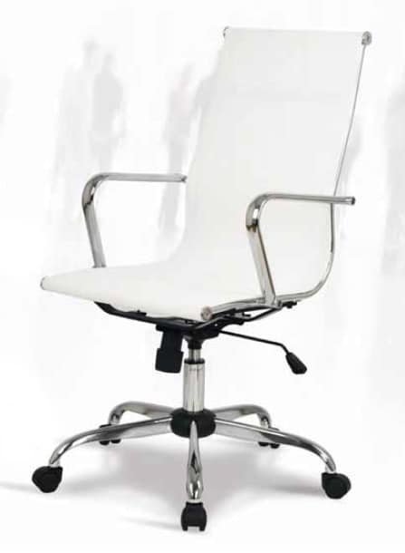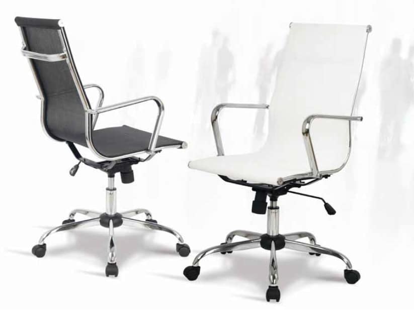 Bürostuhl mit hohem Rücken. Sitz und Rückenlehne im Netz. Mit Metallarmlehnen in der Struktur integriert. Drehfuß auf Rädern. In der Höhe verstellbar.