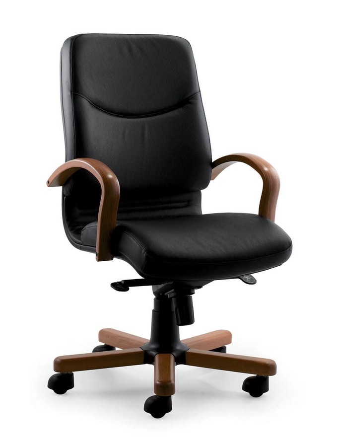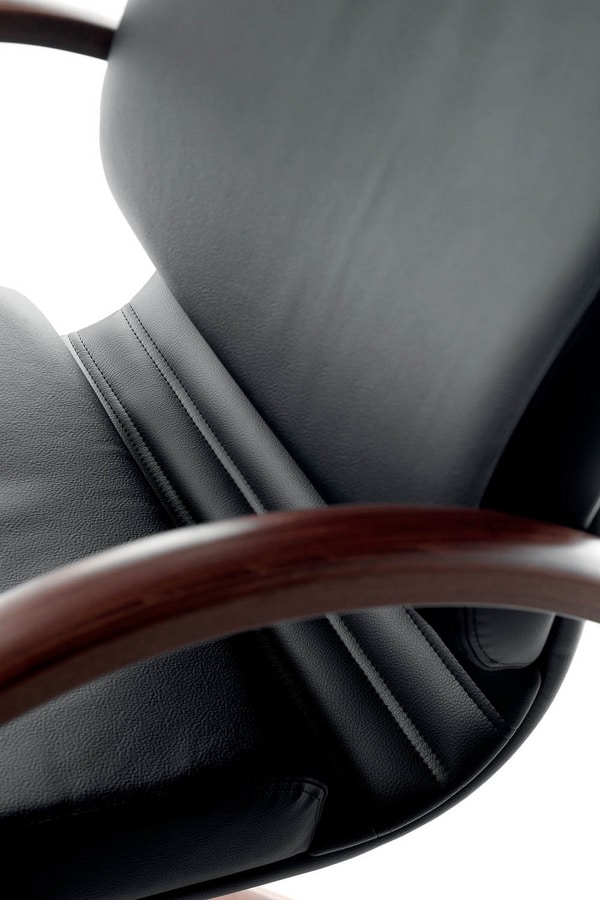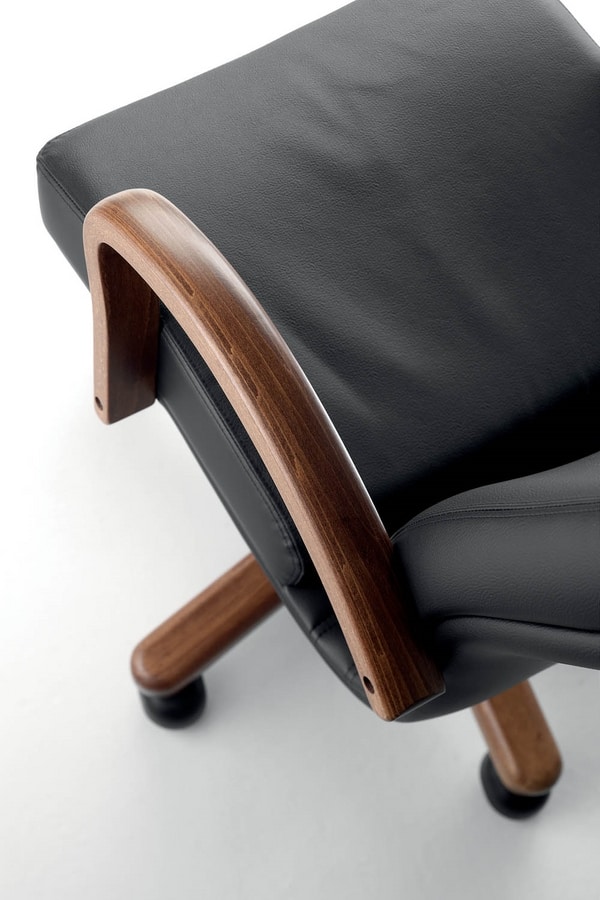 Directional Sessel mit Holzrahmen und Armlehnen, Lenkrollen. Ausgestattet mit modernen Dreh- und Holzschale. Komfortabler Ledersitz mit niedrigem Rücken, in Italien hergestellt.