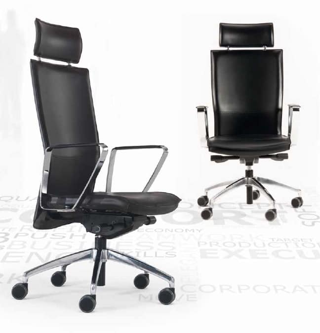 Bürostuhl mit hoher Rückenlehne. Ausgestattet mit einer komfortablen Kopfstütze. Lederpolsterung. Metallarmlehnen. Ausgestattet mit ergonomischen Anpassungen. Feste Höhe.