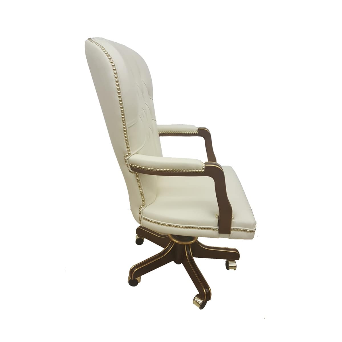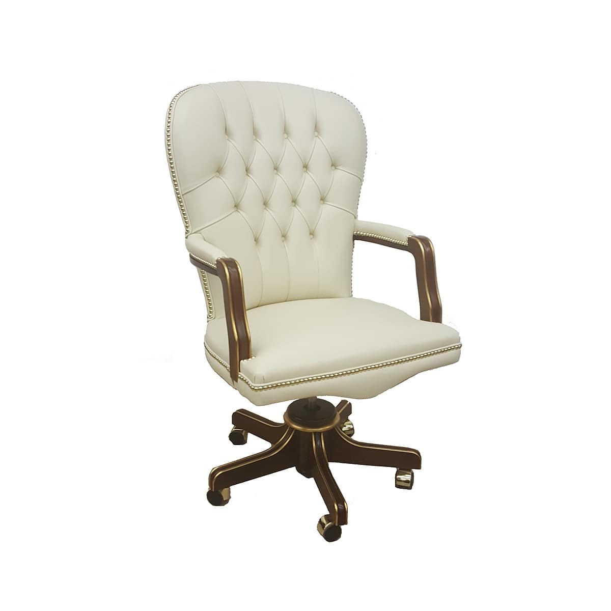 Bequemer Bürosessel aus massivem Holzrahmen und gepolstertem Polyurethanschaum und mit der Möglichkeit der Verwendung von feuerhemmenden Schaum. Dieser Sessel ist in der Höhe mit dem Auf- und Abwärtsmechanismus und der zentralen Neigungseinstellung einstellbar, mit Kippbewegung, die in horizontaler Position verriegelt werden kann, die auf einer 5-Stern-Basis mit Lenkrollen befestigt ist. Es ist die reiche Kapitoné-behandelten Polsterung und die eine nach dem anderen zu unterscheiden. Polsterung: Echtes Leder, Kunstleder und Stoff.