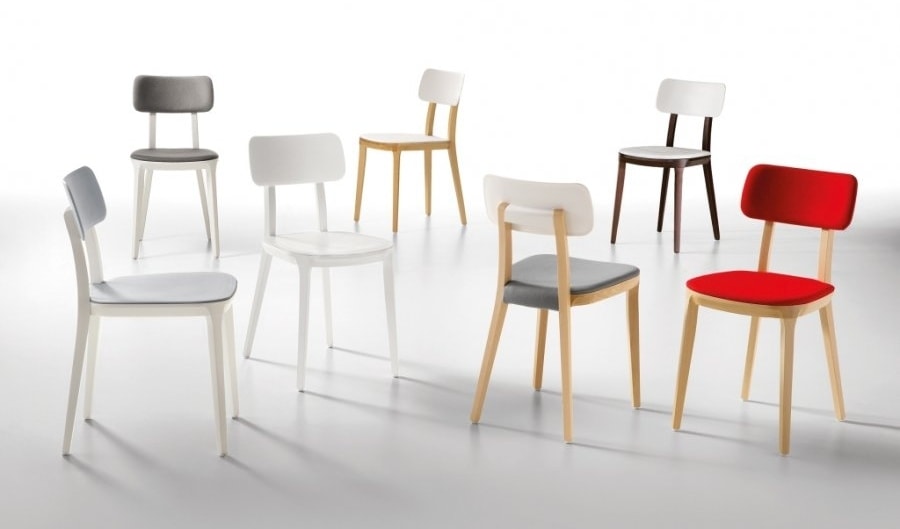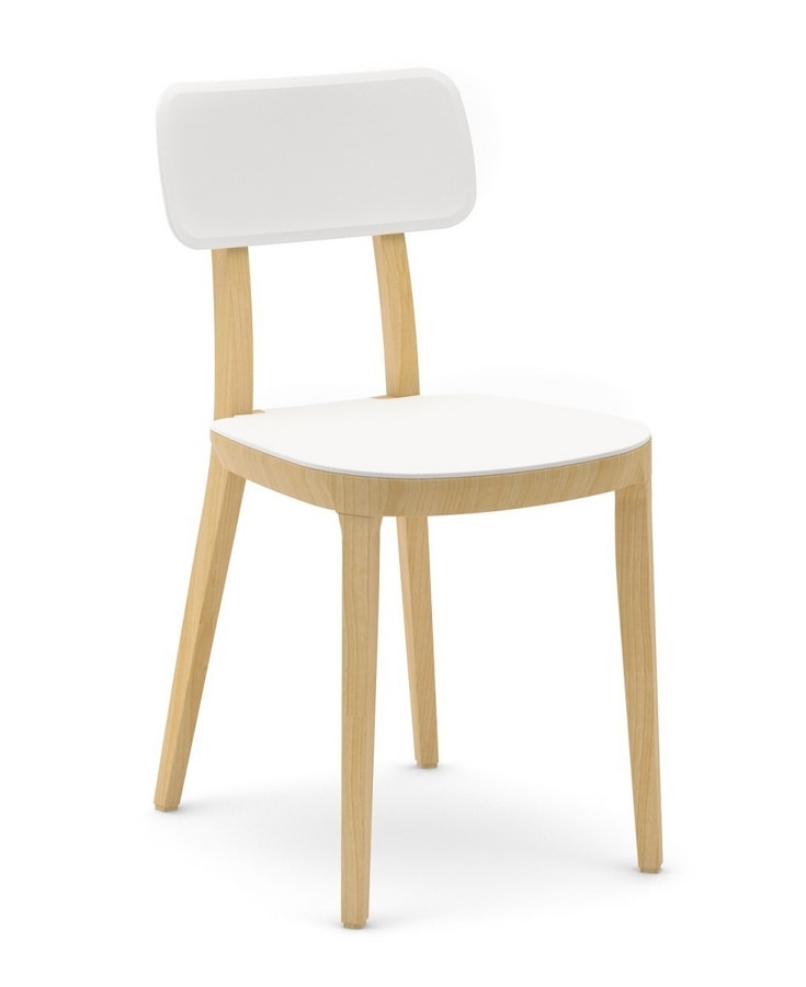Stuhl mit Gestell aus massivem Buchenholz, wenghe, weiß oder schwarz lackiert, Sitz aus Polypropylen mit Musterfarben.