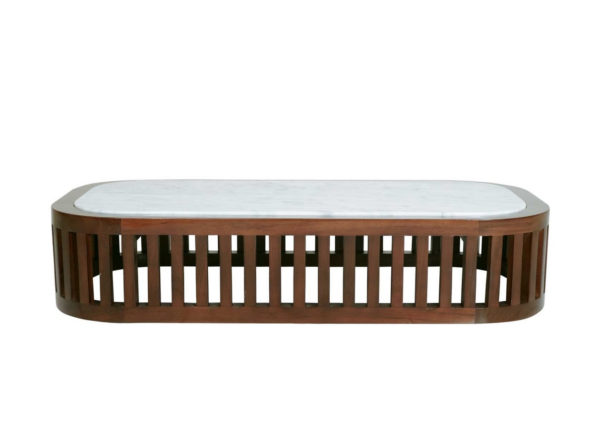 Couchtisch mit Teakholzstruktur, in der Standardversion mit Mahagoni-Yacht- und weißem Marmor-Finish. Die Möbel der Peninsula-Kollektion sind perfekt für alle, die Möbel mit modernen Linien und edlen Materialien lieben, mit dekorativen Details, die den maritimen Geschmack unterstreichen. Eine Mischung aus weichen Formen und kontrastierenden geometrischen Elementen, die dank der Brillanz der Oberfläche ein Spiel sanfter Reflexionen erzeugt, in denen die Umgebungslichter widerhallen. Die abgerundeten Linien der Einrichtung empfangen den Gast in einer Atmosphäre vergangener Zeiten und umgeben ihn mit Schönheit, Energie und ausgewogenen Formen.