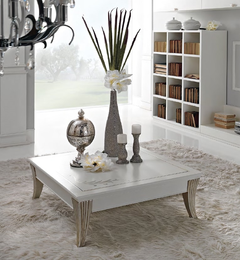 Preise anfordern Ähnliche ProdukteQuadratischer Couchtisch in lackiertem Holz mit Silberdekoration und Beinen.