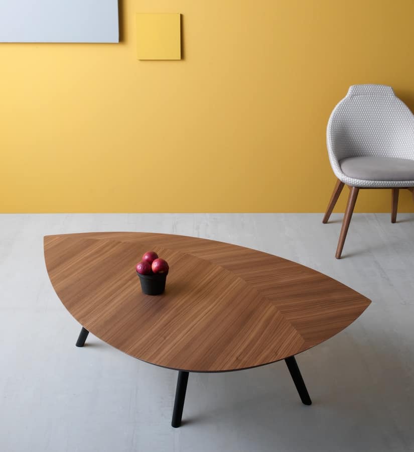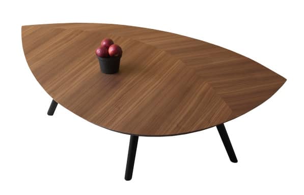 Couchtisch mit matt schwarz lackierten Holzbeinen. Blattform oben in Nussbaum Canaletto oder verbrannt Eichenfurnierholz.