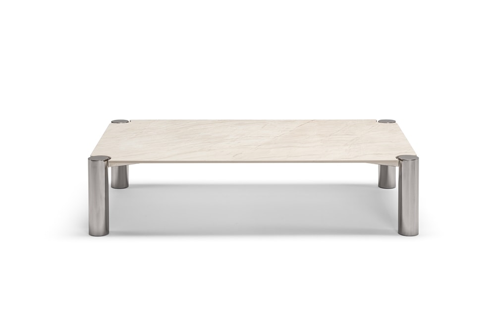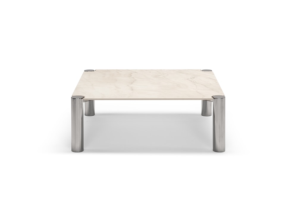 Mit seiner Ästhetik, die mit Farb- und Materialkombinationen spielt, ist der Duo-Couchtisch des Modells Vision die ideale Ergänzung für eine minimalistische, vielseitige und dennoch gesellige Einrichtungsstimmung. Der Couchtisch Vision ist das Ergebnis der geschickten Zusammensetzung einer Steinzeugplatte, in deren Inneren sich röhrenförmige Metallfüße befinden, und ist in quadratischer oder rechteckiger Form erhältlich. Es gibt zahlreiche Möglichkeiten, die Ausführungen der Tischplatte – erhältlich in drei verschiedenen Optionen – und der Füße – erhältlich in vier verschiedenen Ausführungen – individuell anzupassen: poliert, verchromt, Titan oder Calamin-Eisen.