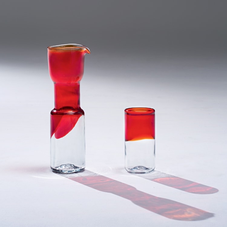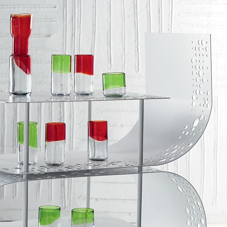 Das Karaffen- und Glasset besteht aus Muranoglas in Grün und Rot.