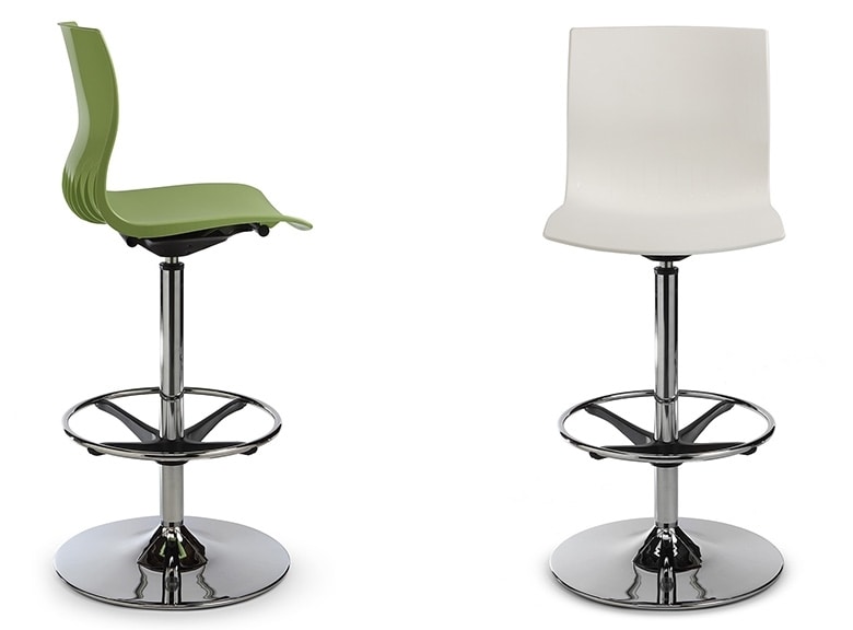 Auch Versionen mit rutschhemmendem Schieber oder drehbarem 4-Bein-Schreibtablett mit Gasanpassung mit Orbital-Tablett erhältlich. Drehbare Versionen mit 4 konischen Beinen aus weiß oder schwarz lackiertem oder gebürstetem und poliertem Aluminium mit Rädern oder Füßen. Drehbare Modelle mit automatischer Rückführung oder mit Gasheber, auf verchromtem Glassockel, auch in Hockerversion mit Fußstütze.