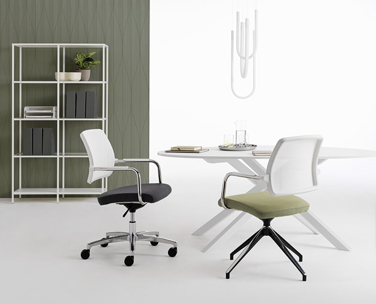 Kos Air ist ein Gästestuhl für Arbeitsumgebungen, Warte- oder Besprechungsbereiche. Erhältlich als Kufen-, Vierfuß-, Festdreh- oder Rollengestell erfüllt es vielfältige funktionale und ästhetische Ansprüche. Erhältlich mit schwarzer oder weißer Netzrückenlehne und verchromter oder schwarz lackierter Rohrstruktur.