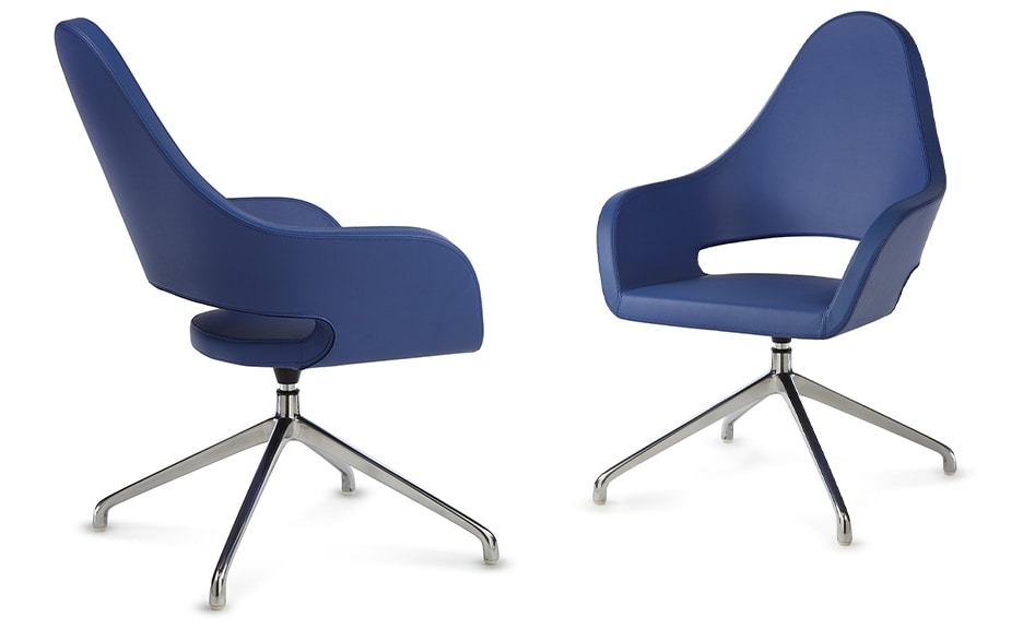 Ausführungen: mit 4-Speichen-Fuß aus gebürstetem Aluminium und poliertem Fuß - mit 5-Sterne-Fuß auf Füßen aus lackiertem oder gebürstetem poliertem Aluminium - mit Kelch aus verchromtem Metall - alles drehbar und mit automatischer Rückführung. Mit 4-Fußgestell in weiß oder schwarz oder gebürstetem und poliertem Aluminium, schwenkbar.