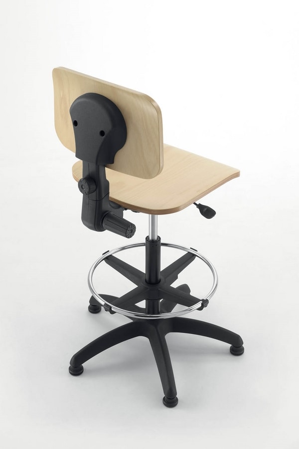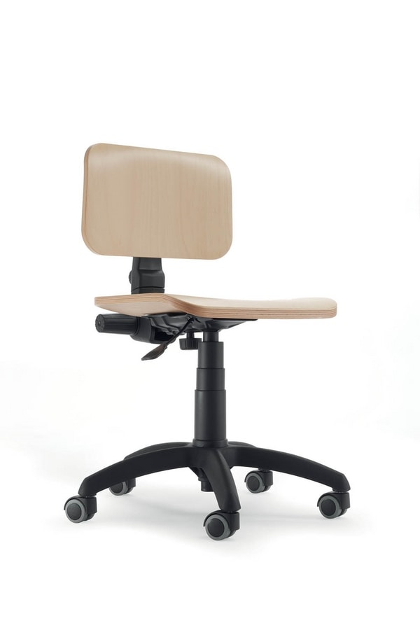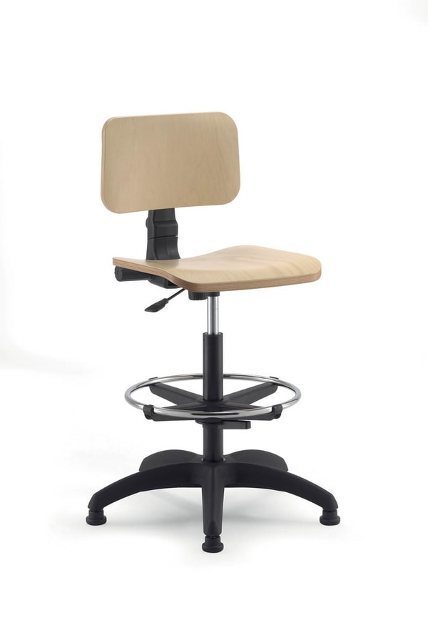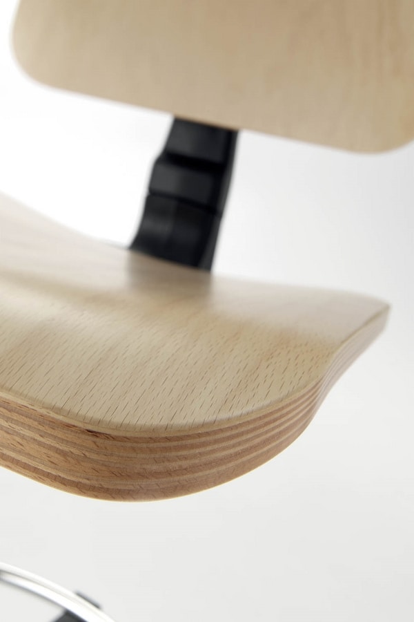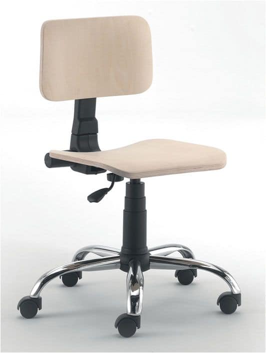 Stuhl mit Nylon oder verchromtem Gestell auf Rädern oder feste Beine. Gaslift. Sitz und Rückenlehne in Buche natur lackiert. Auch erhältlich Hocker Fußstütze mit Sunburst im Nylon.