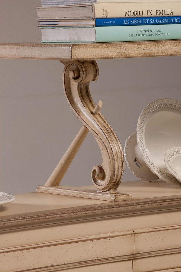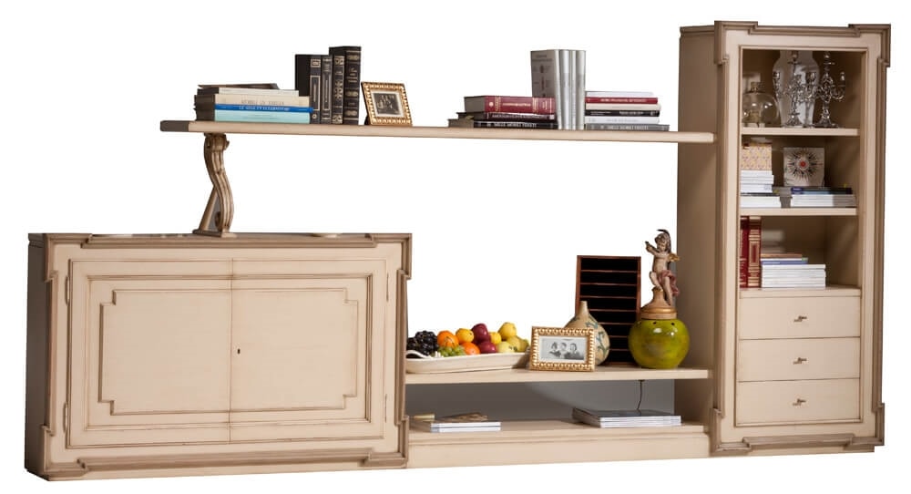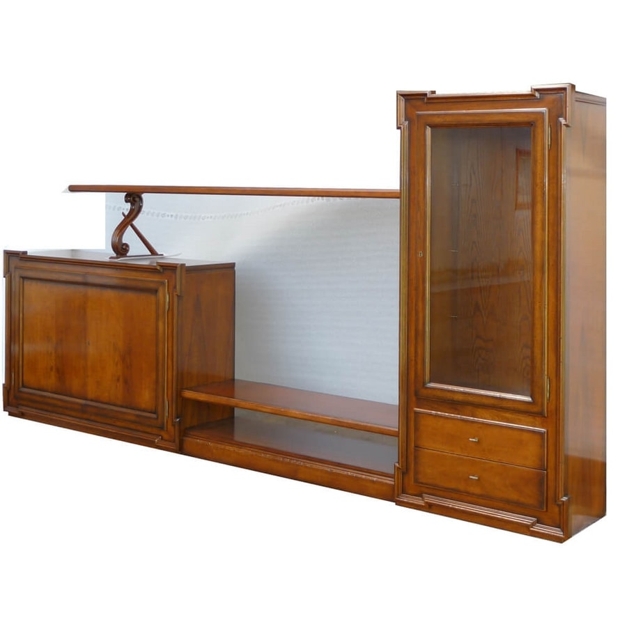 Die Cheope-Konfiguration. Ein wesentlicher Bestandteil einer neuen Kollektion modularer Elemente, die sich durch Austauschbarkeit und Vielseitigkeit auszeichnen. Rechts ein Vitrinenmodul mit herausnehmbaren Regalen, einer Glastür und zwei Schubladen. Links ein Sideboard-Modul mit internem Regal und flach getäfelten Türen. Ein geformtes Gesims umrahmt die beiden, die dann mit offenen Regalen und handgeschnitzten Stützen verbunden werden. Auf dem Foto gebeiztes Holz (Code: MI10) mit normaler Belastung.