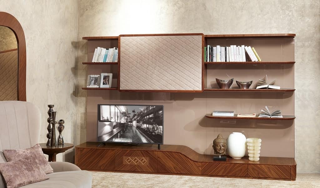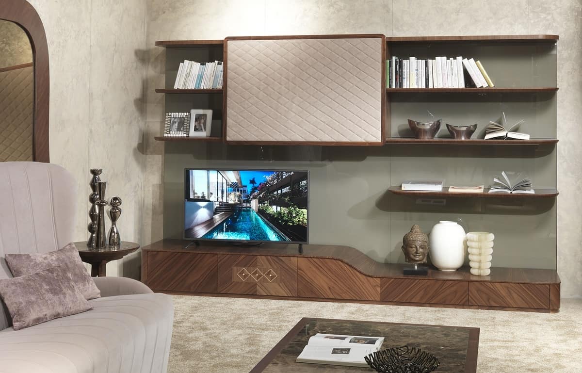 Möbel für Wohnzimmer in amerikanischem Nussbaum natur, mit Wandstruktur in glänzend lackiertem Glas, eingelegt in Nussbaum und Ahorn, in klassischen, zeitgenössischen Stil.