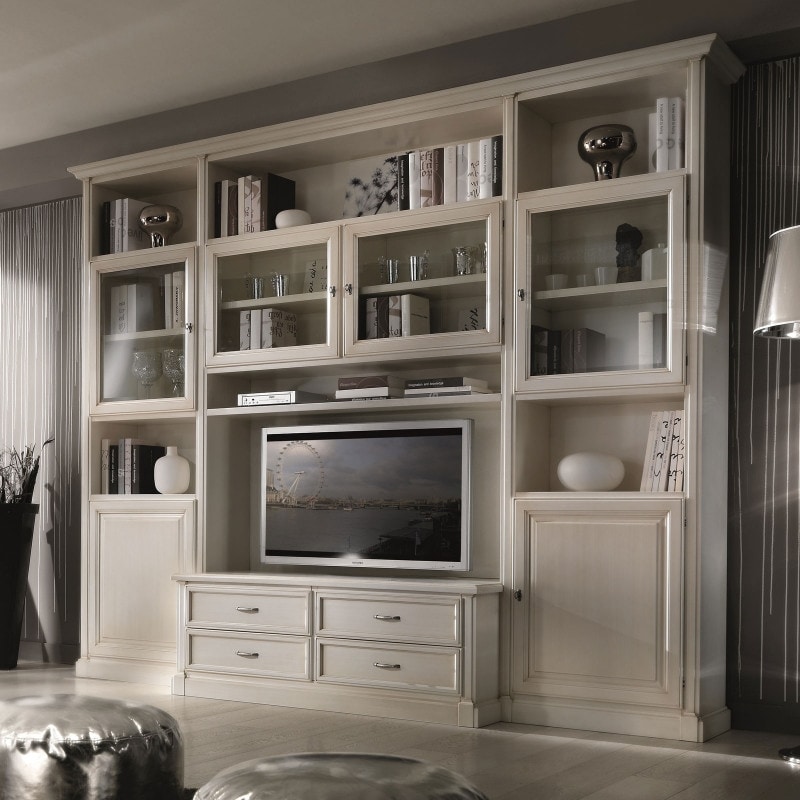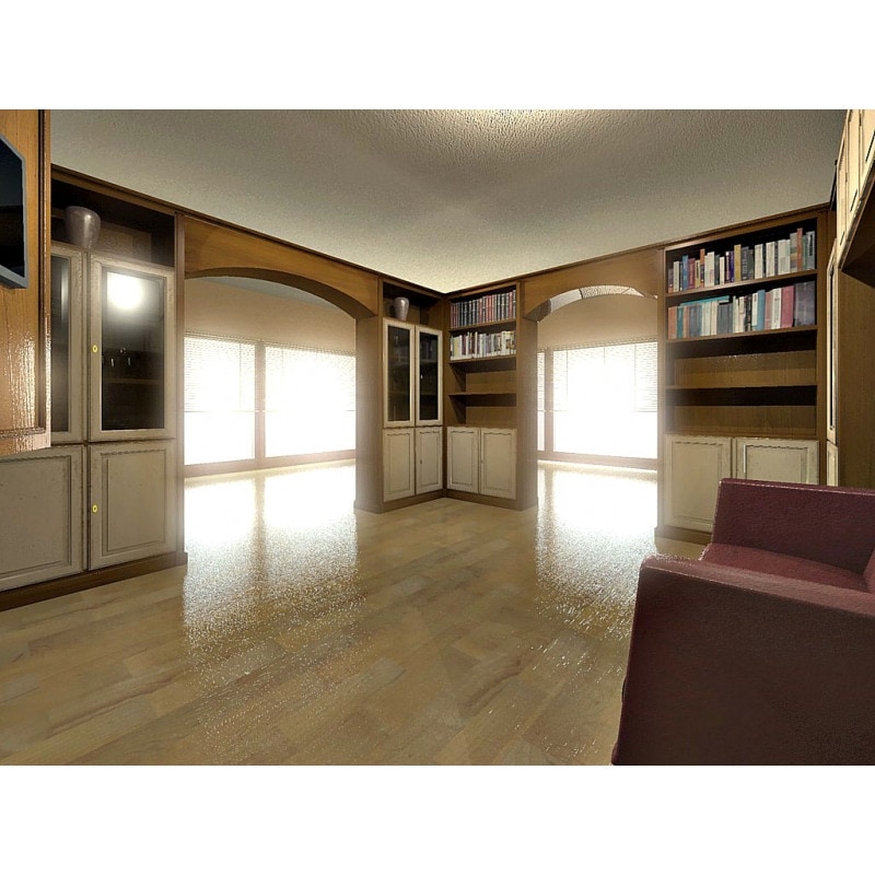 Diese ausgestattete Wand umfasst einen fortschrittlichen Korpus mit vier Schubladen und einen Bücherregalteil mit offenen Fächern und Fächern, die durch Holz- oder Glastüren geschlossen sind. Im unteren Teil wurden Holztüren eingesetzt, damit Sie all die sperrigen Dinge hineinlegen können, die Sie nicht sehen möchten, während im oberen Teil vier Glastüren für die Präsentation verwendet werden. Über dem TV-Fach befindet sich eine Ablage für Decoder und DVD-Player.