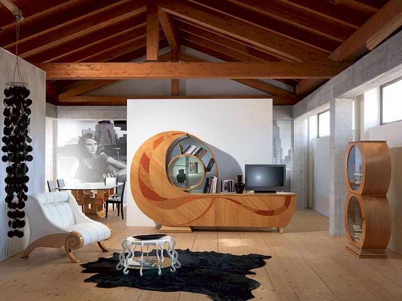 Dies ist ein Möbelstück, das Funktionalität mit Schönheit und die als Vitrine, Bücherregal, Sideboard und TV-Tisch verwendet werden. Es wurde entwickelt, asymmetrisch mit Absicht, um die Originalität, die ganze verleihen. Der runde Kirschholz Struktur ist sehr schwer zu machen und zeigt eine ausgezeichnete Möbeltischlerei auch durch eine Spirale Einlage diverser Arten von Briarwood bereichert. Der Rücken ist der Spiegel hergestellt und in den Regalen, asymmetrisch mit Absicht, aus transparentem Kristall.