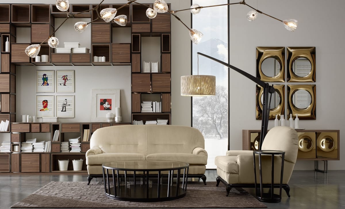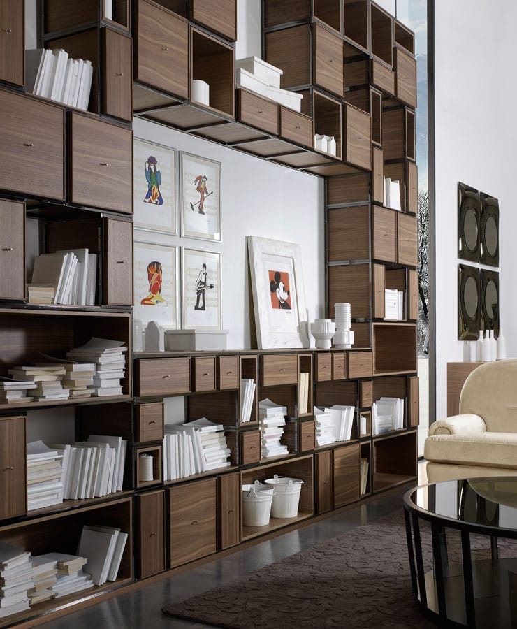 Um ein funktionales und raffiniertes System zu schaffen, wurde die Werkstatt von Volpi inspiriert durch die 1950er Jahre, als Design die Frucht der Fantasie der Experten war. Metall spielt die Hauptrolle und erstreckt sich im Raum in einer perfekten, strengen Geometrie und mit der Kreativität einer modularen Struktur. Metallausführungen vorhanden: antike Bronze lackiert oder nikel schwarz lackiert.